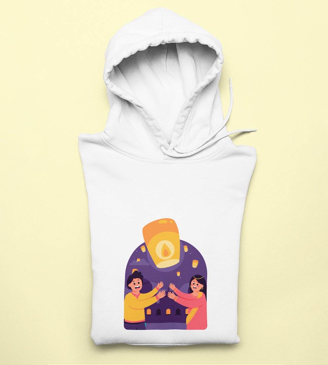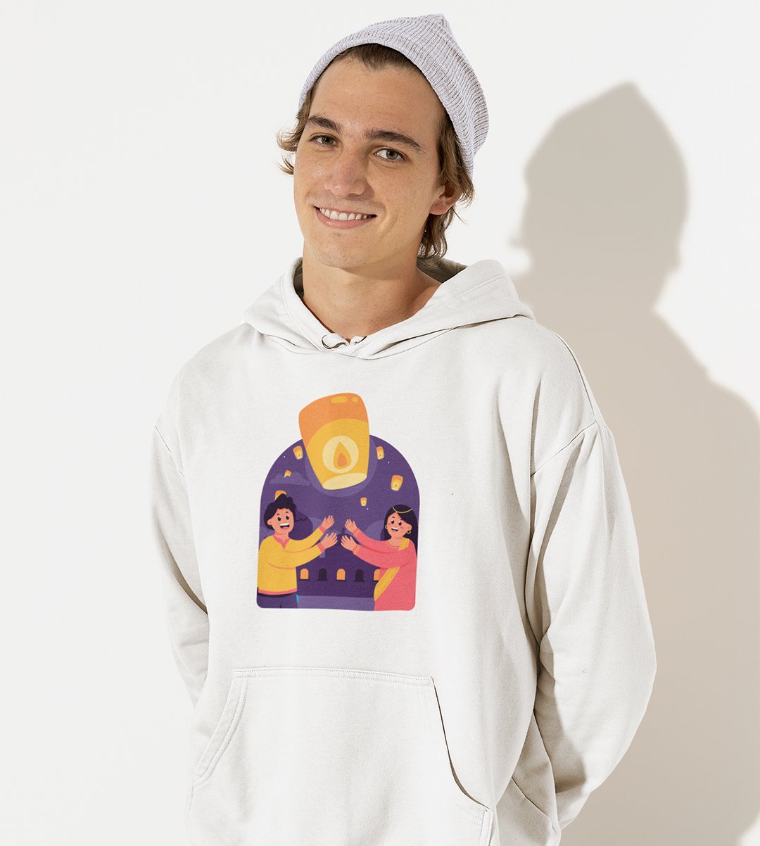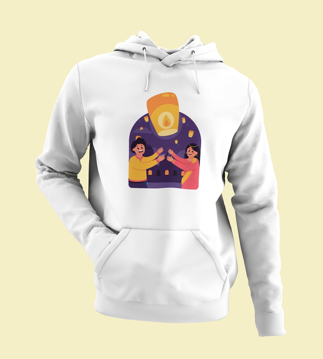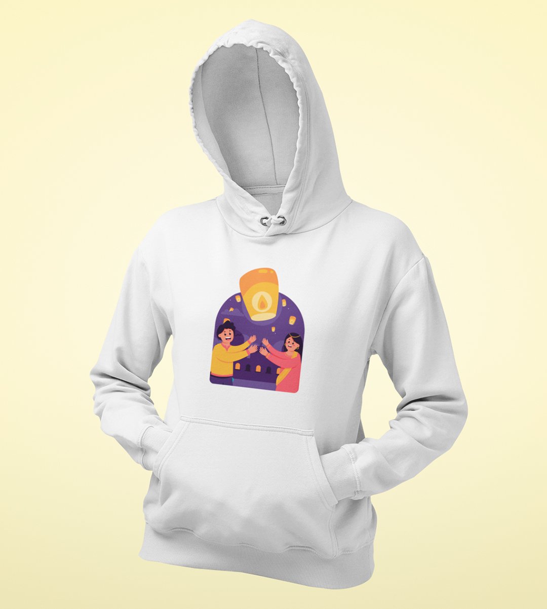 Illuminate your moments with the magic of Diwali night. Our Diwali Night Lantern White Hoodie features a charming design of a lantern soaring into the night sky, symbolizing the Festival of Light and Hope. Sip your favorite brew and let the warm glow of this White Hoodie brighten your day, just like the radiance of Diwali.