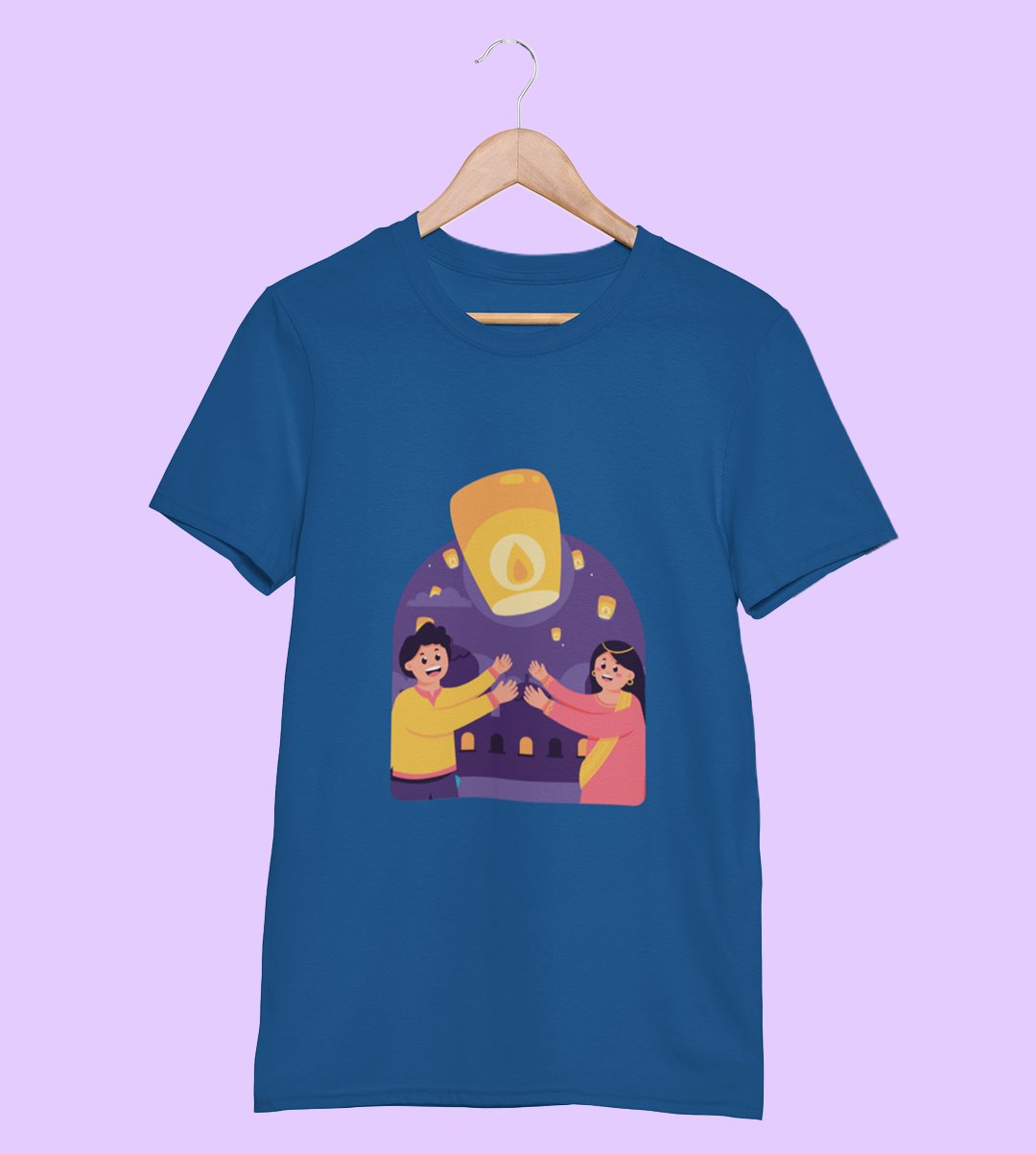 Air balloon & animated couple printed diwali themed unisex round neck blended blue t-shirt specially for diwali festival