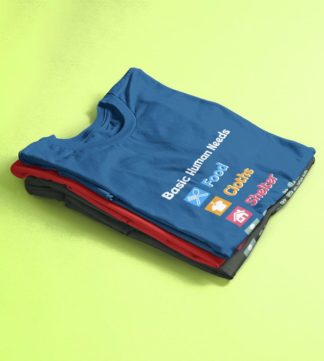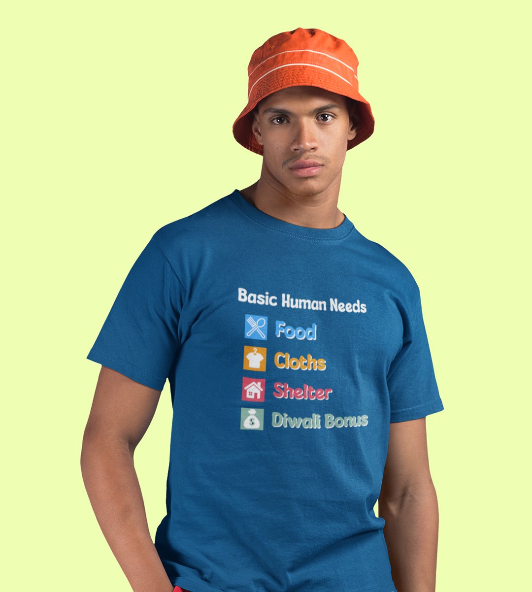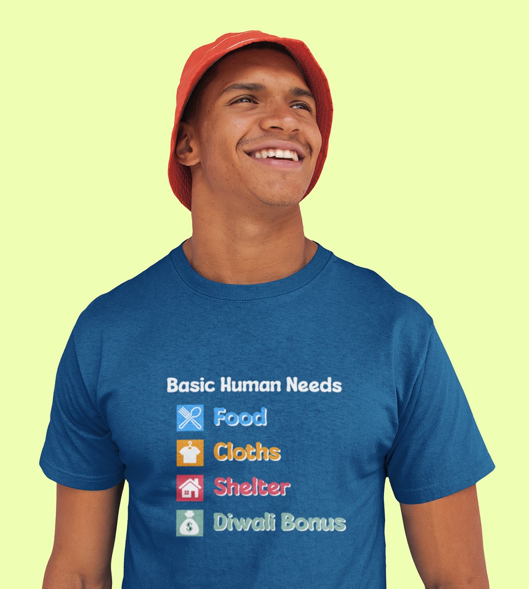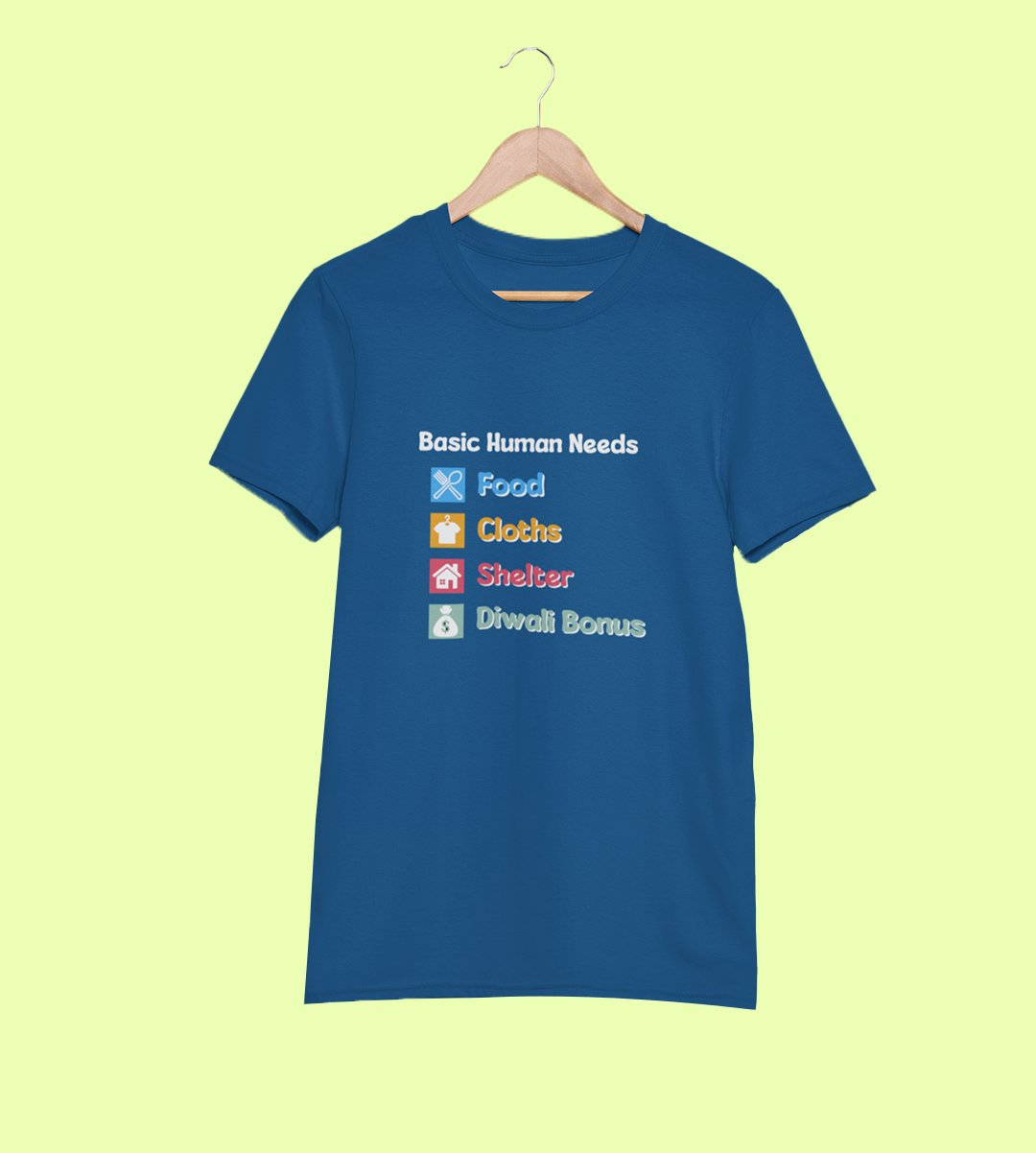 Basic human needs printed diwali themed unisex round neck blended blue t-shirt specially for diwali festival