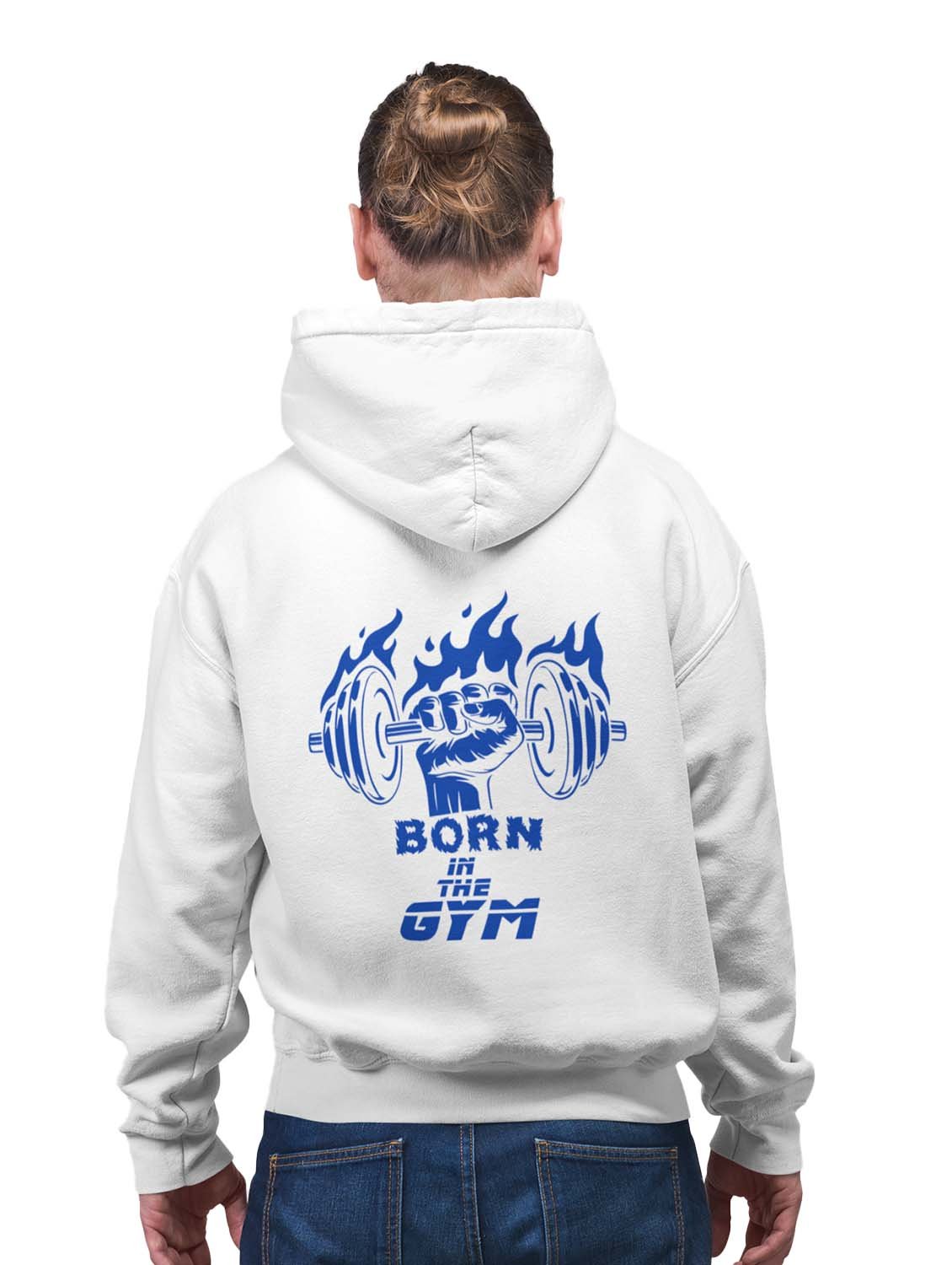 Born In The Gym, Fist In Blue Flame printed artswear white hoodies for winter casual wear specially for Men