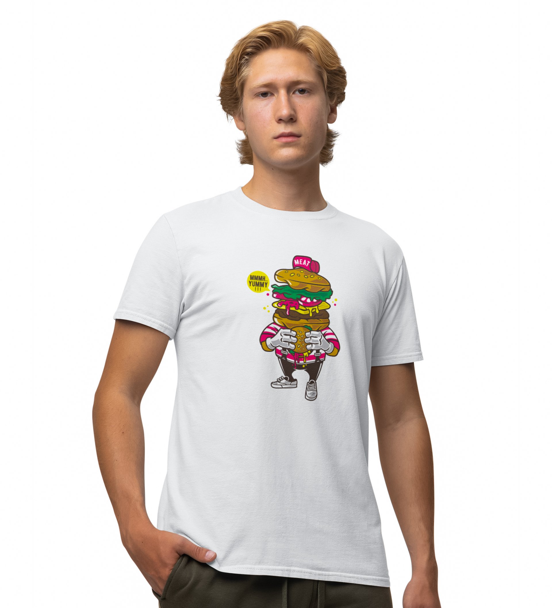 Hungry Burger White Round Neck Cotton Half Sleeved Men's T-Shirt with Printed Graphics