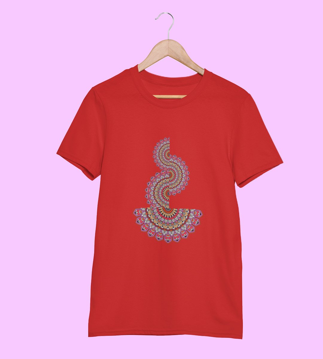 Designable semi-curved mandala colourful art printed diwali themed unisex round neck blended red t-shirt specially for diwali festival