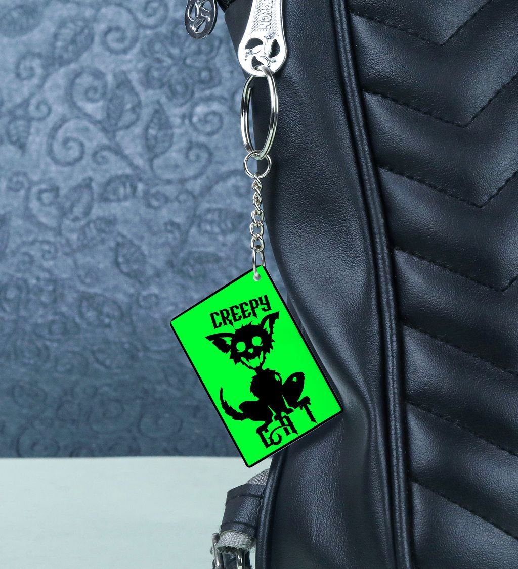 Add a dash of spooky charm to your everyday carry with this Halloween Cat rectangular keychain. Featuring a bewitching black cat design with eerie eyes and festive flair, it