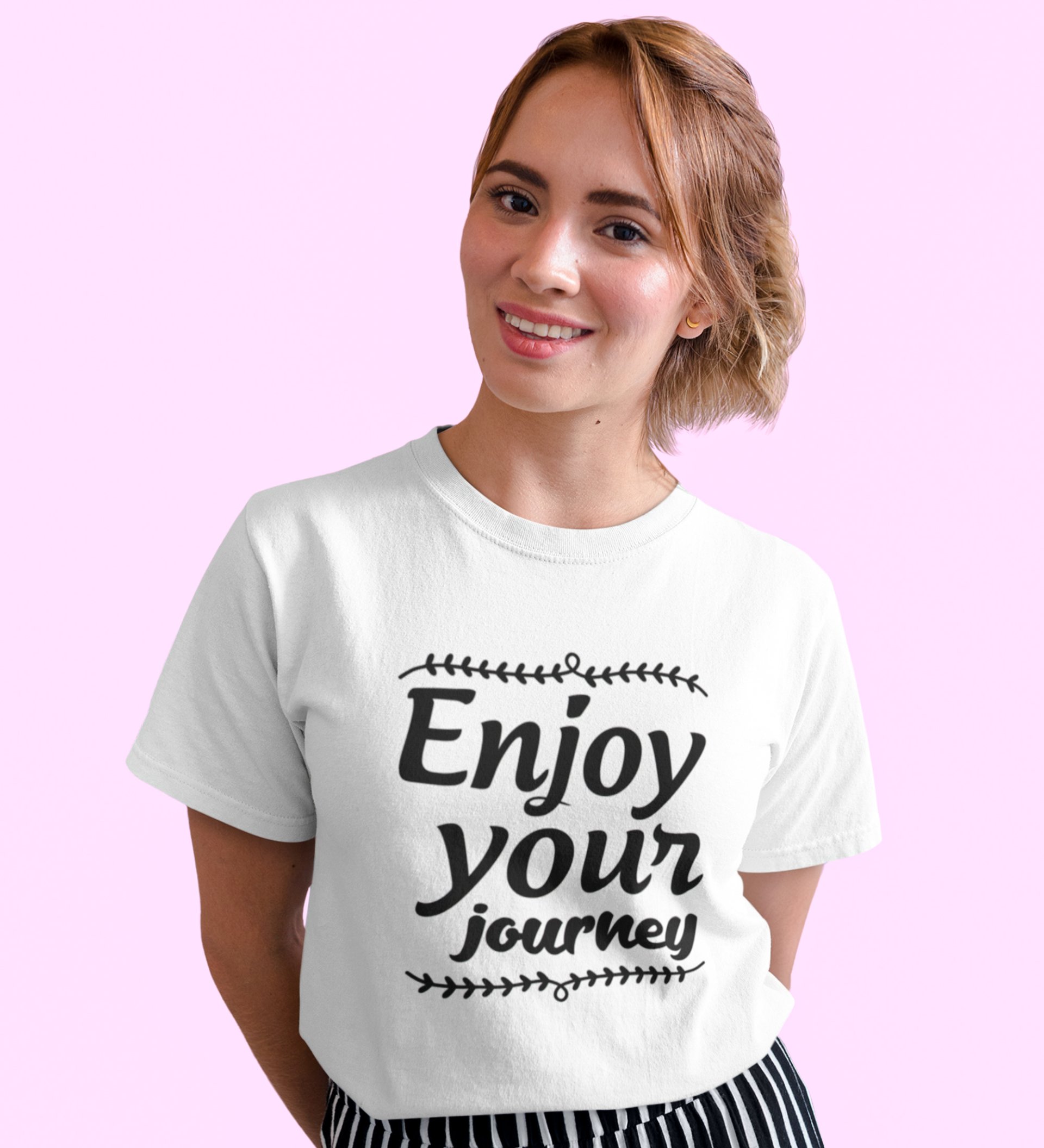 Enjoy Your Journey White Round Neck Cotton Half Sleeved Women's T-Shirt with Printed Graphics
