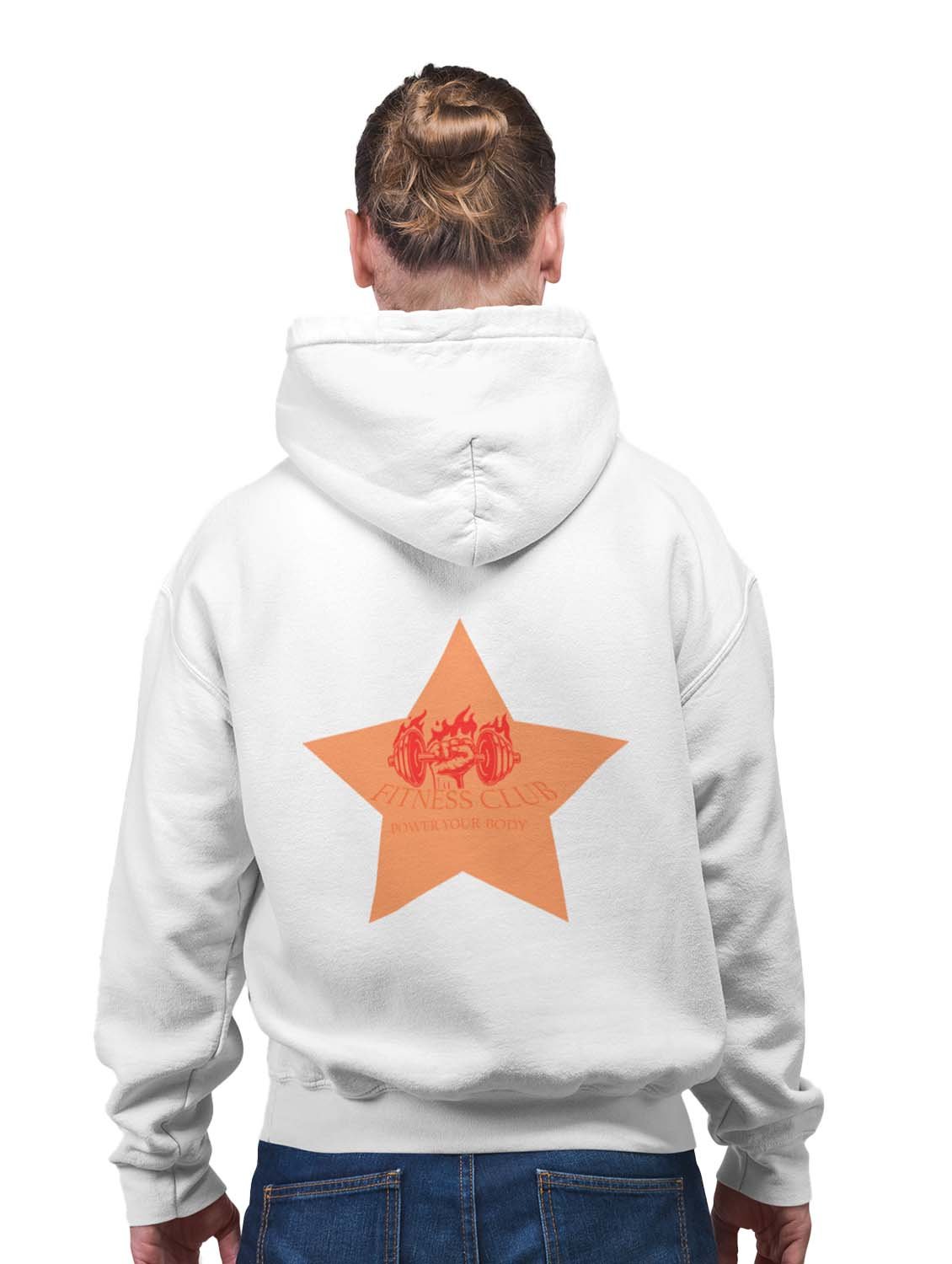 Fitness Club, Power Your Body, (BG Orange Star) printed artswear white hoodies for winter casual wear specially for Men