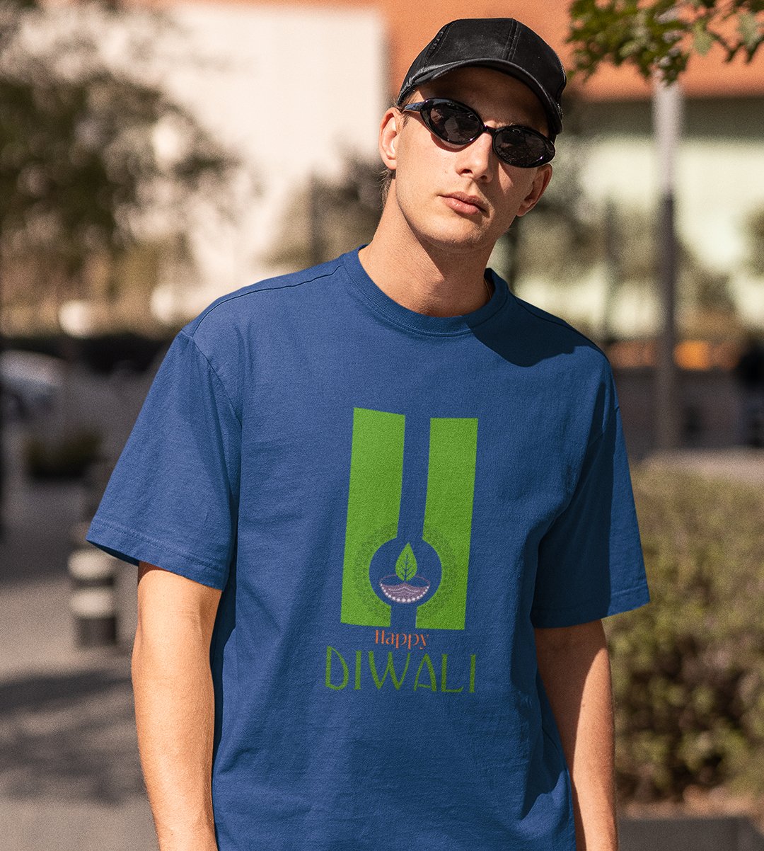 Go green diwali printed diwali themed unisex round neck blended blue t-shirt specially for diwali festival