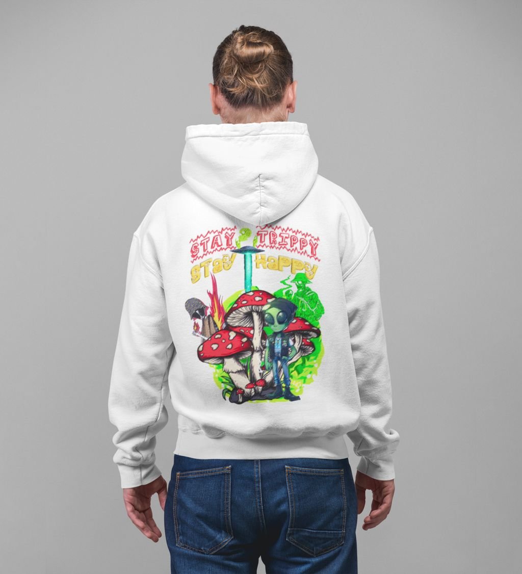 Good Vibes Only Stay Trippy Stay Happy White Cotton Printed Hoodies For Men