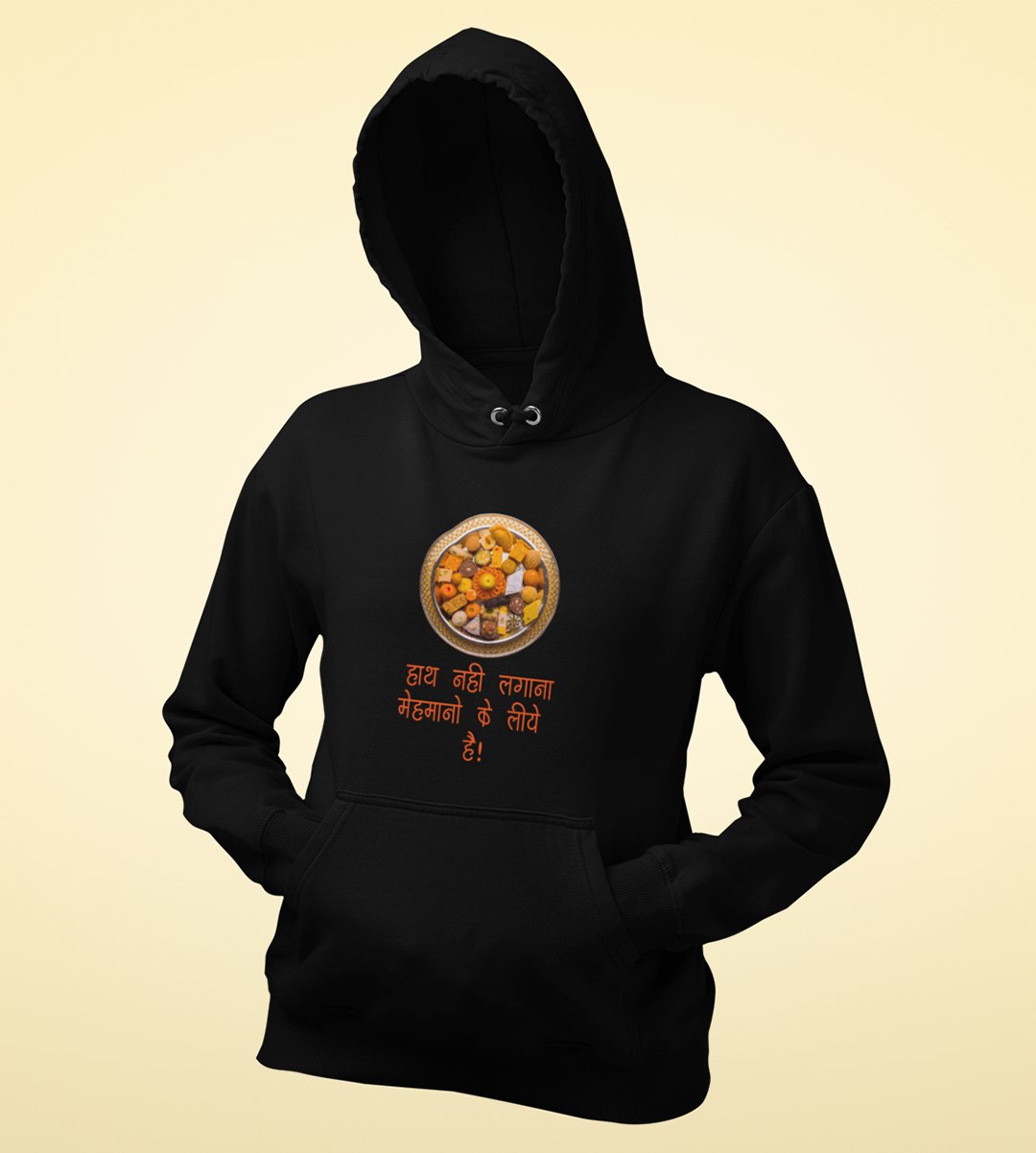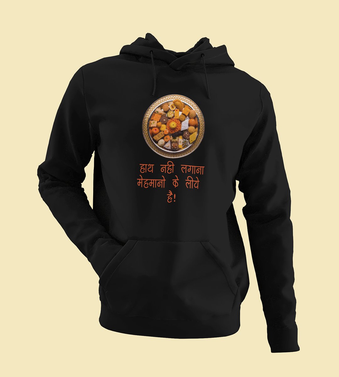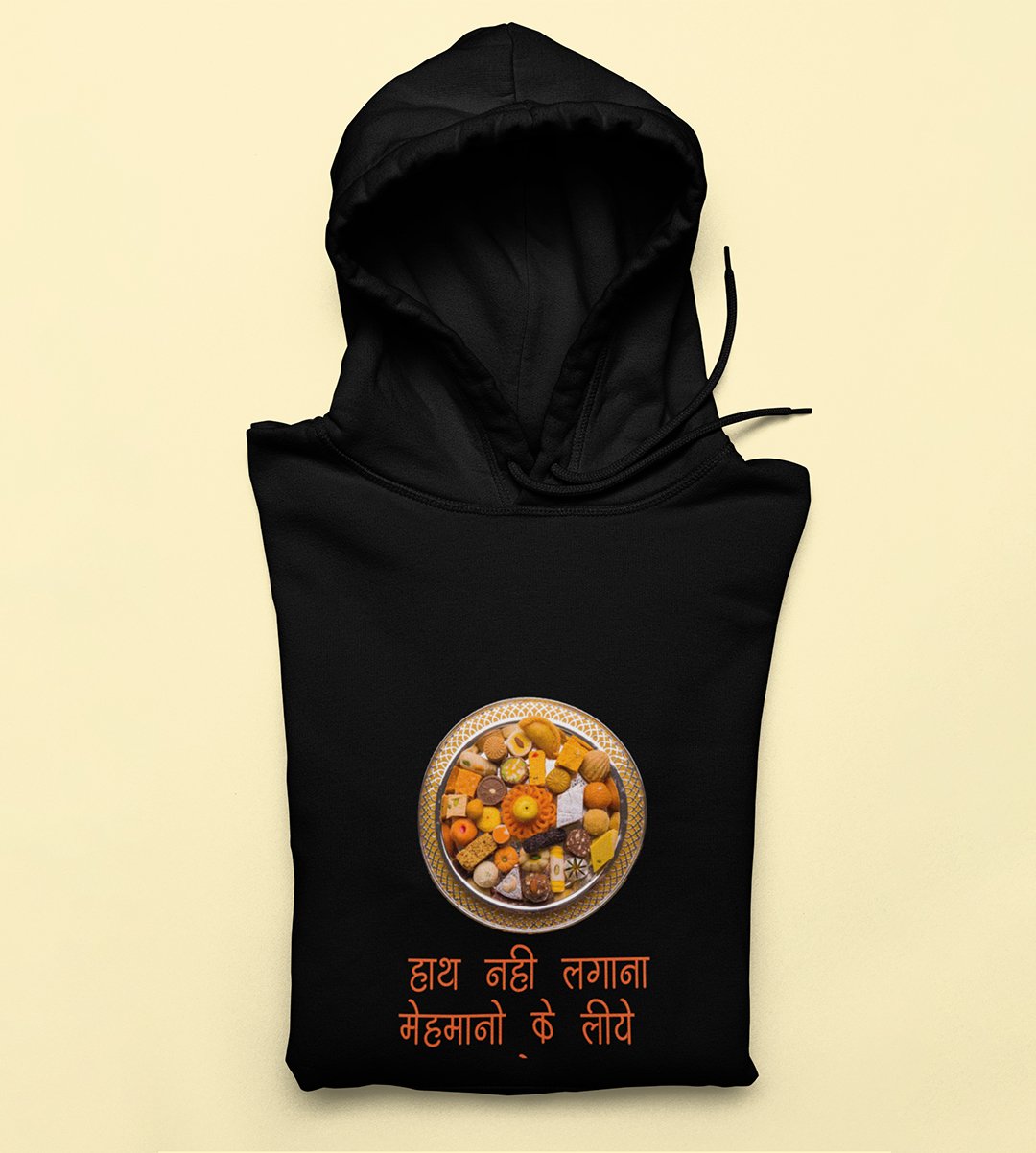 This Diwali, honor the traditions of hospitality with our "Hath Nai Lagana" black Hoodie . Adorned with an image of sweets, it's a delightful reminder that these treats are reserved for guests during the festival. Share the warmth and heritage of Diwali with this charming design.