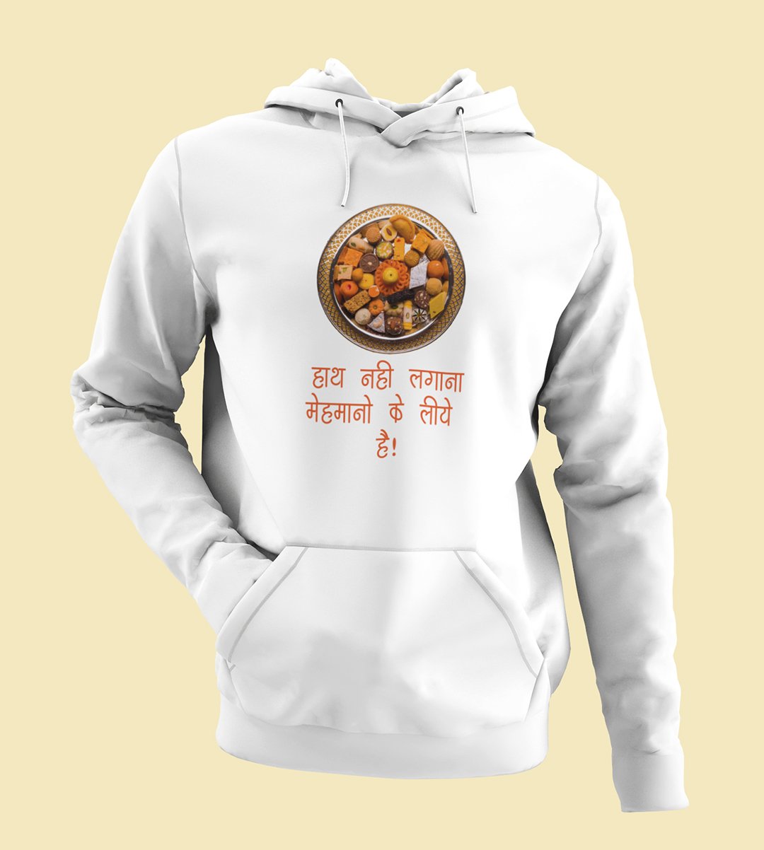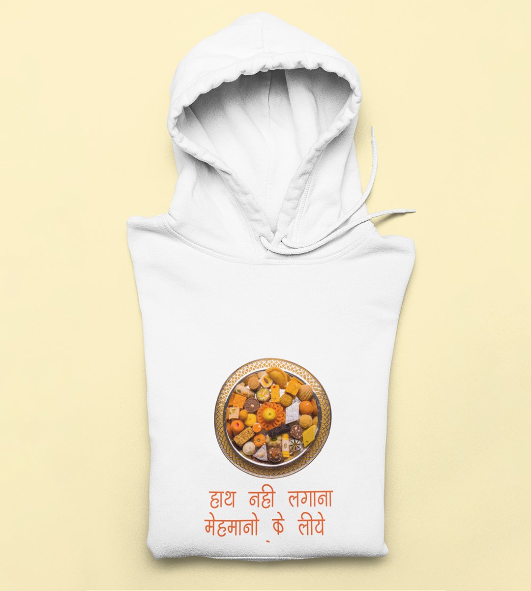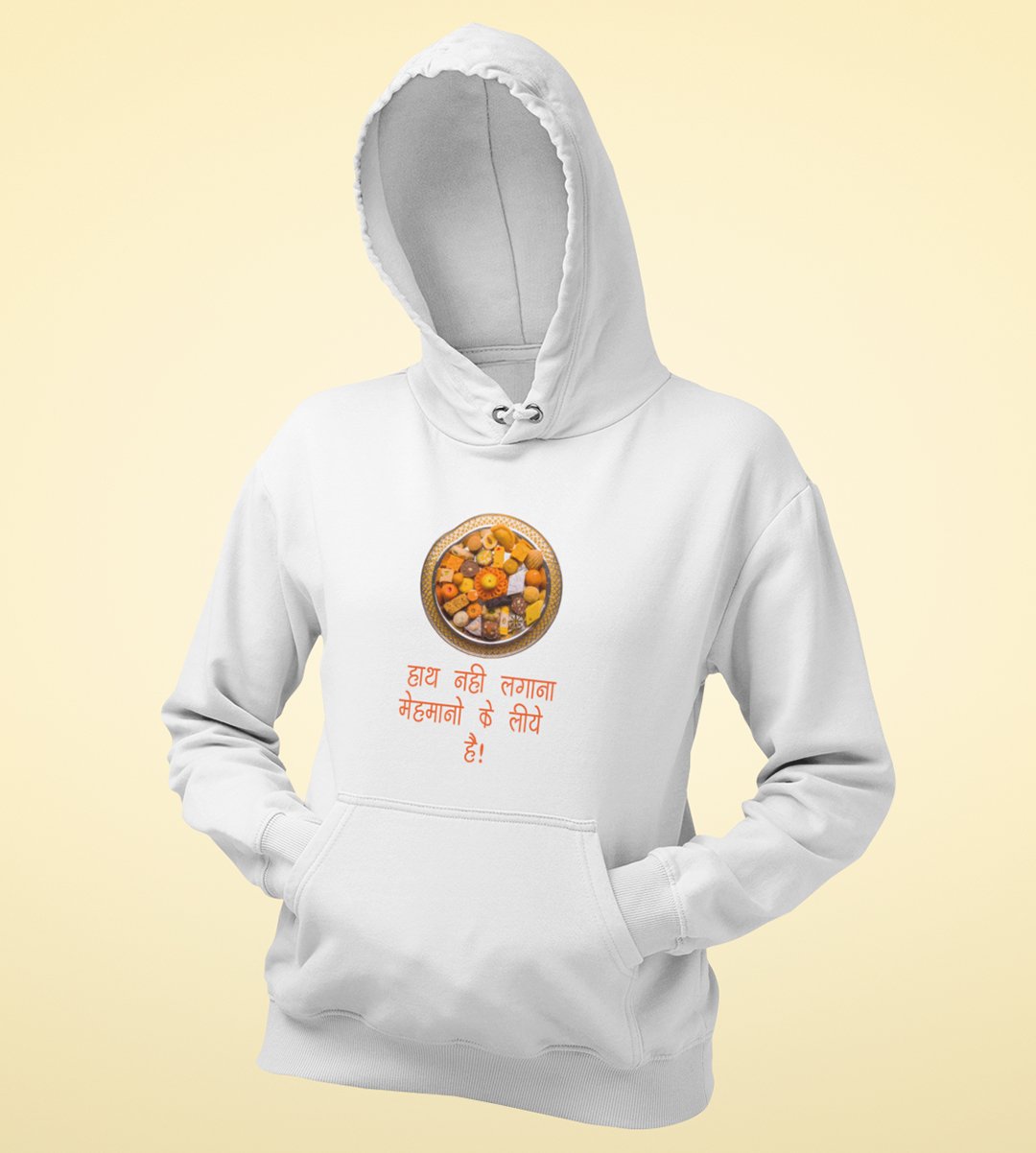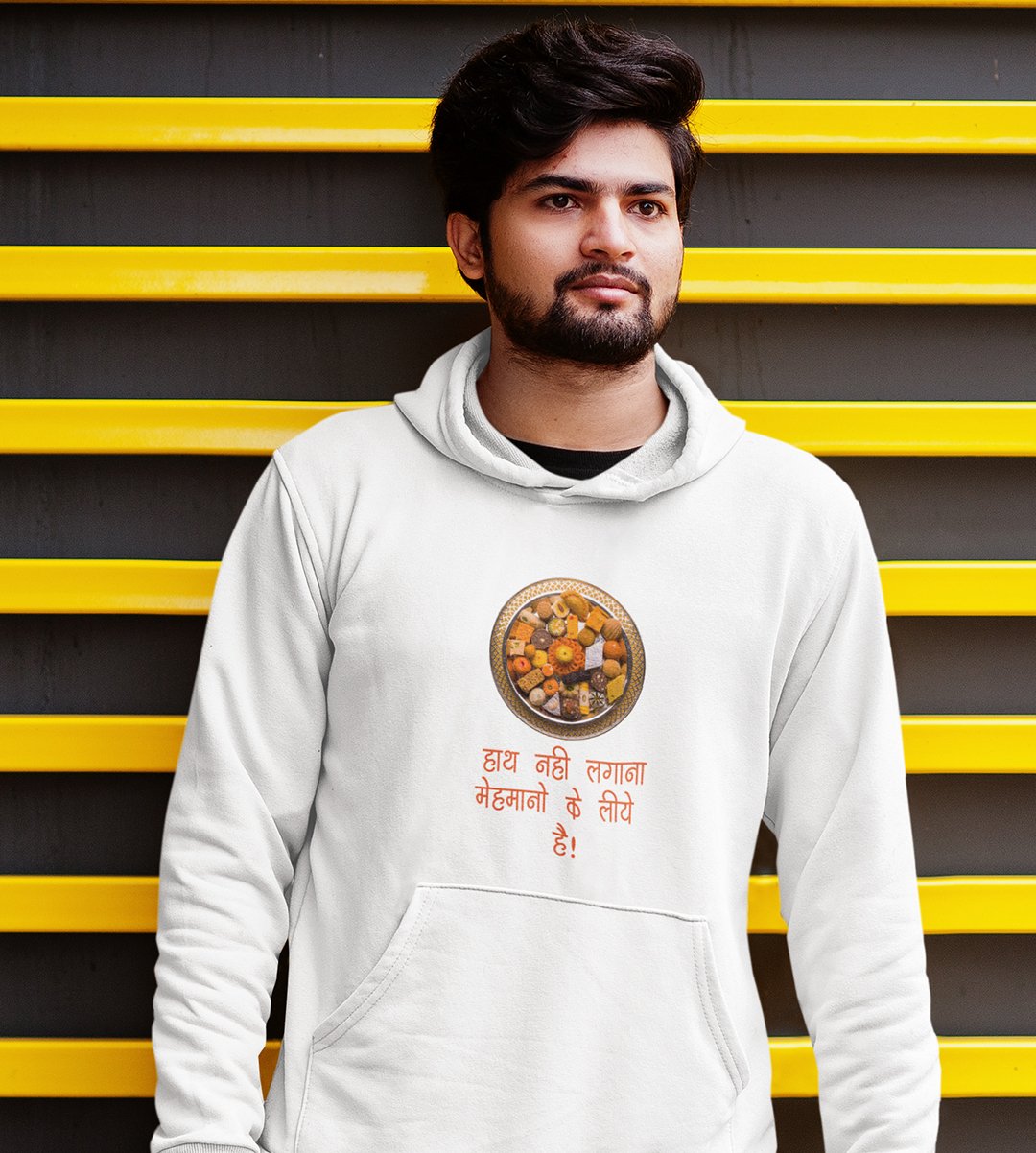 This Diwali, honor the traditions of hospitality with our "Hath Nai Lagana" White Hoodie . Adorned with an image of sweets, it's a delightful reminder that these treats are reserved for guests during the festival. Share the warmth and heritage of Diwali with this charming design.