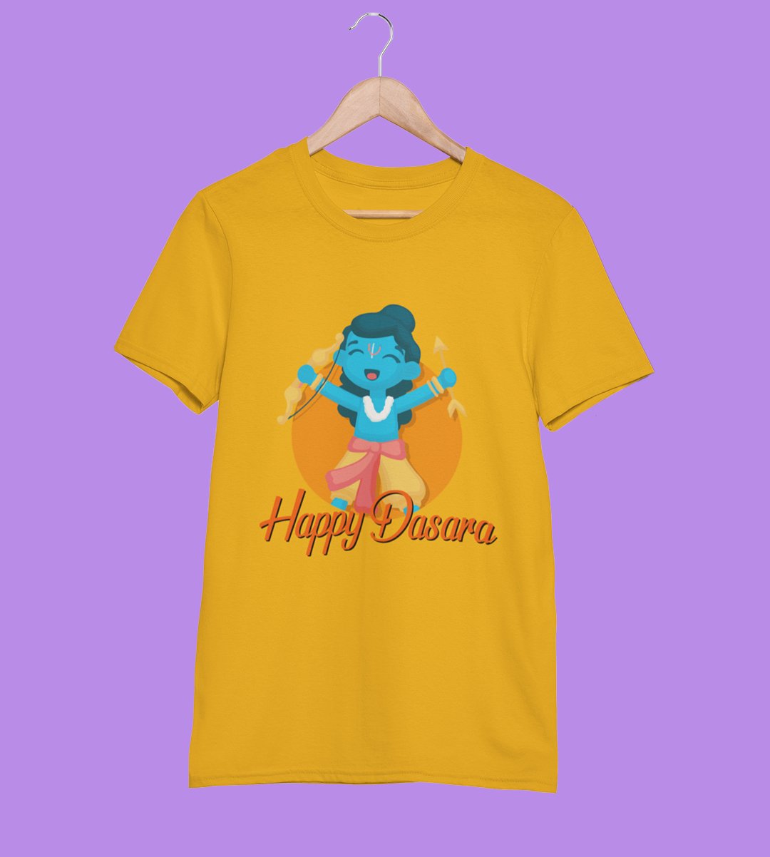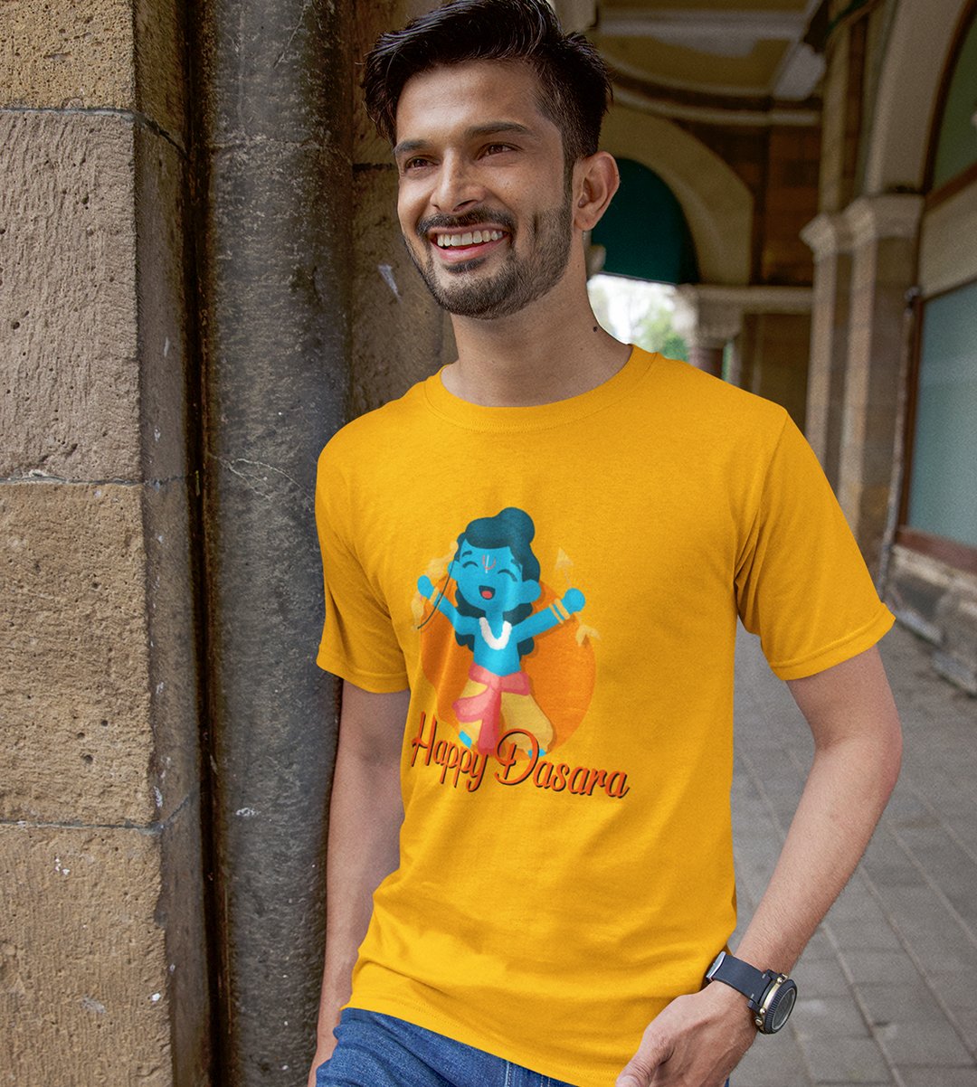 Happy Dasara printed unisex adults round neck cotton half-sleeve yellow tshirt specially for Navratri festival/ Durga puja