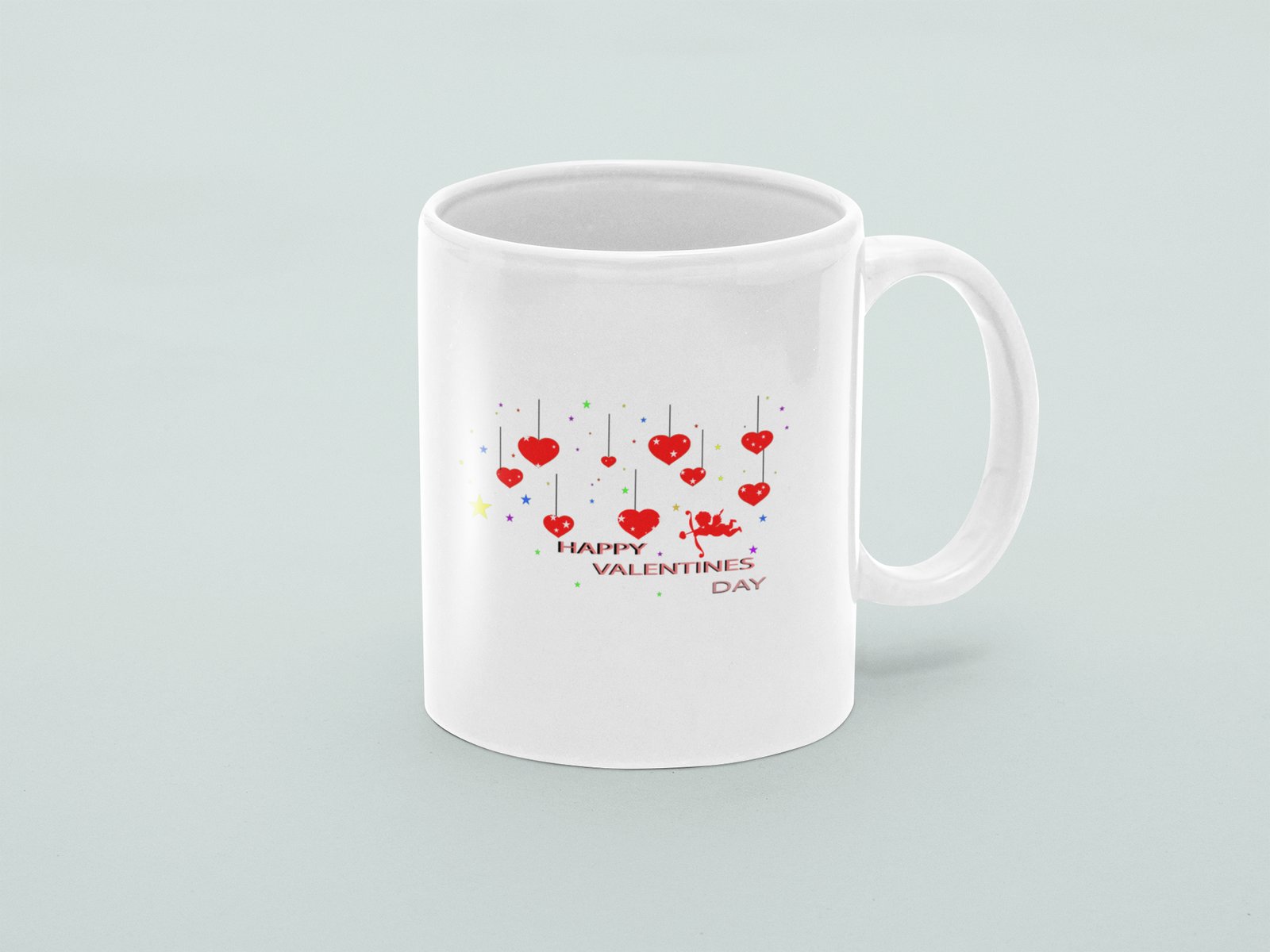 Happy Valentines Day With Hanging Hearts - valentine themed printed ceramic white coffee and tea mugs/ cups