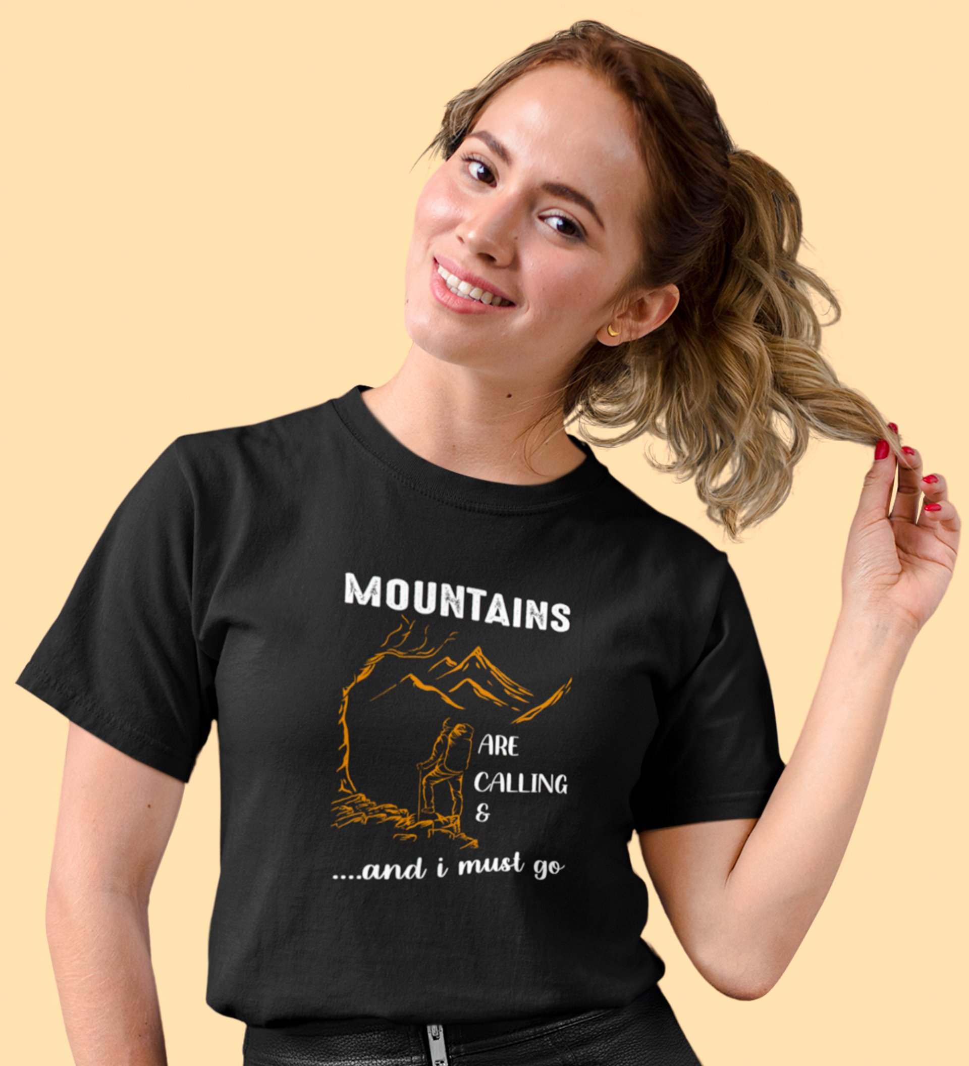 HopOfferThe Call Of Mountains Black Round Neck Cotton Half Sleeved Women's T-Shirt with Printed Graphics