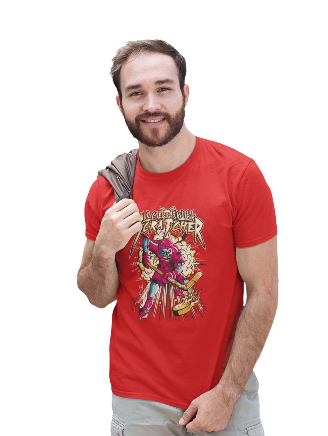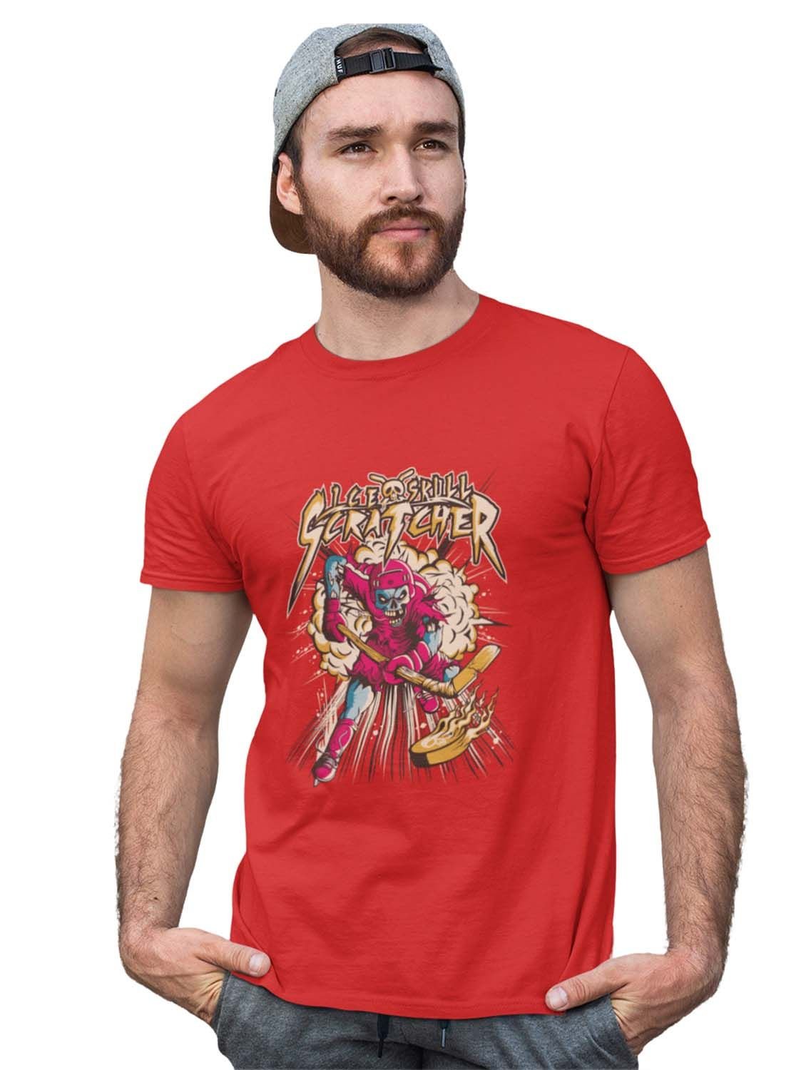Skull Ice Hockey Red Round Neck Cotton Half Sleeved T-Shirt with Printed Graphics