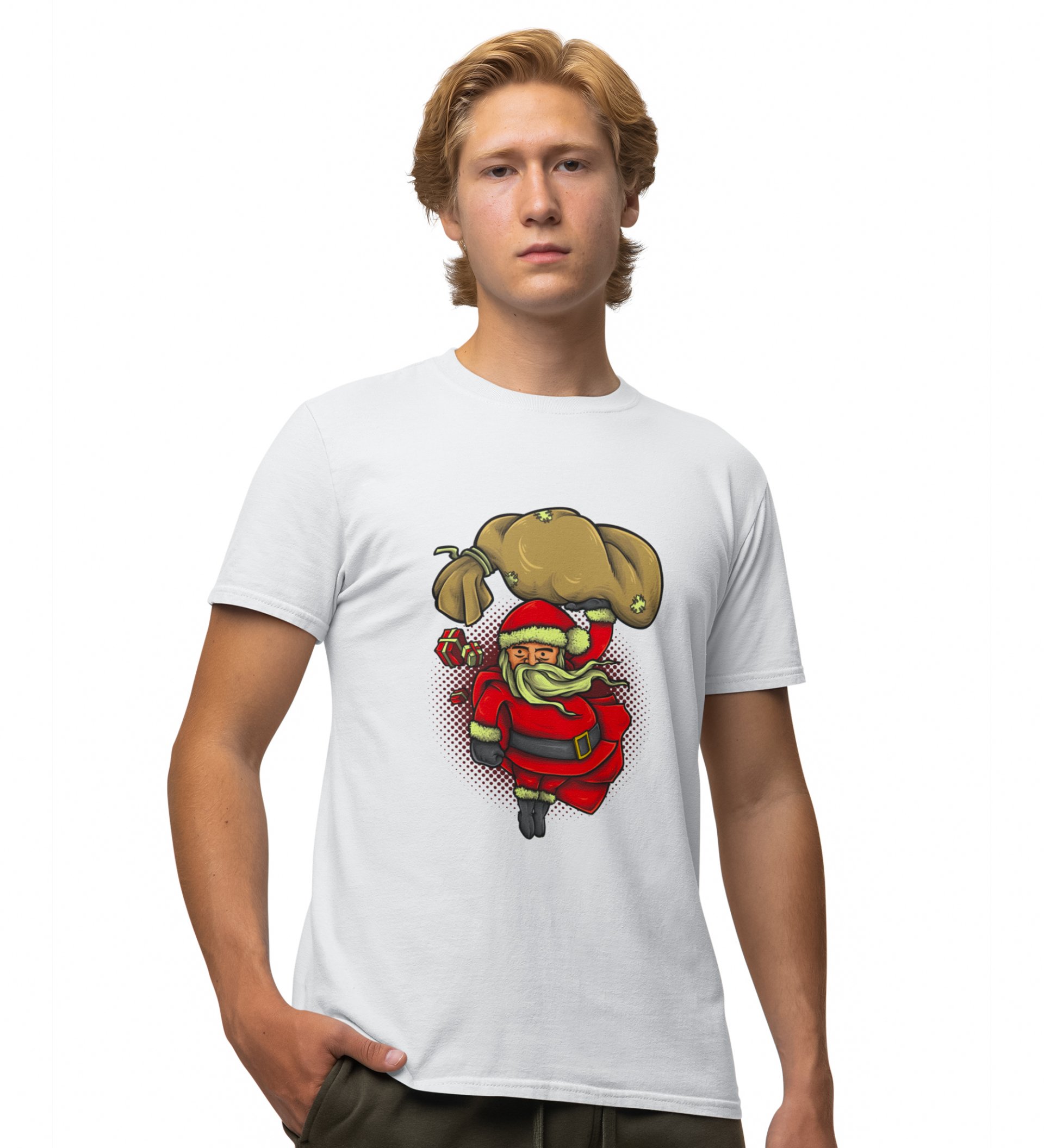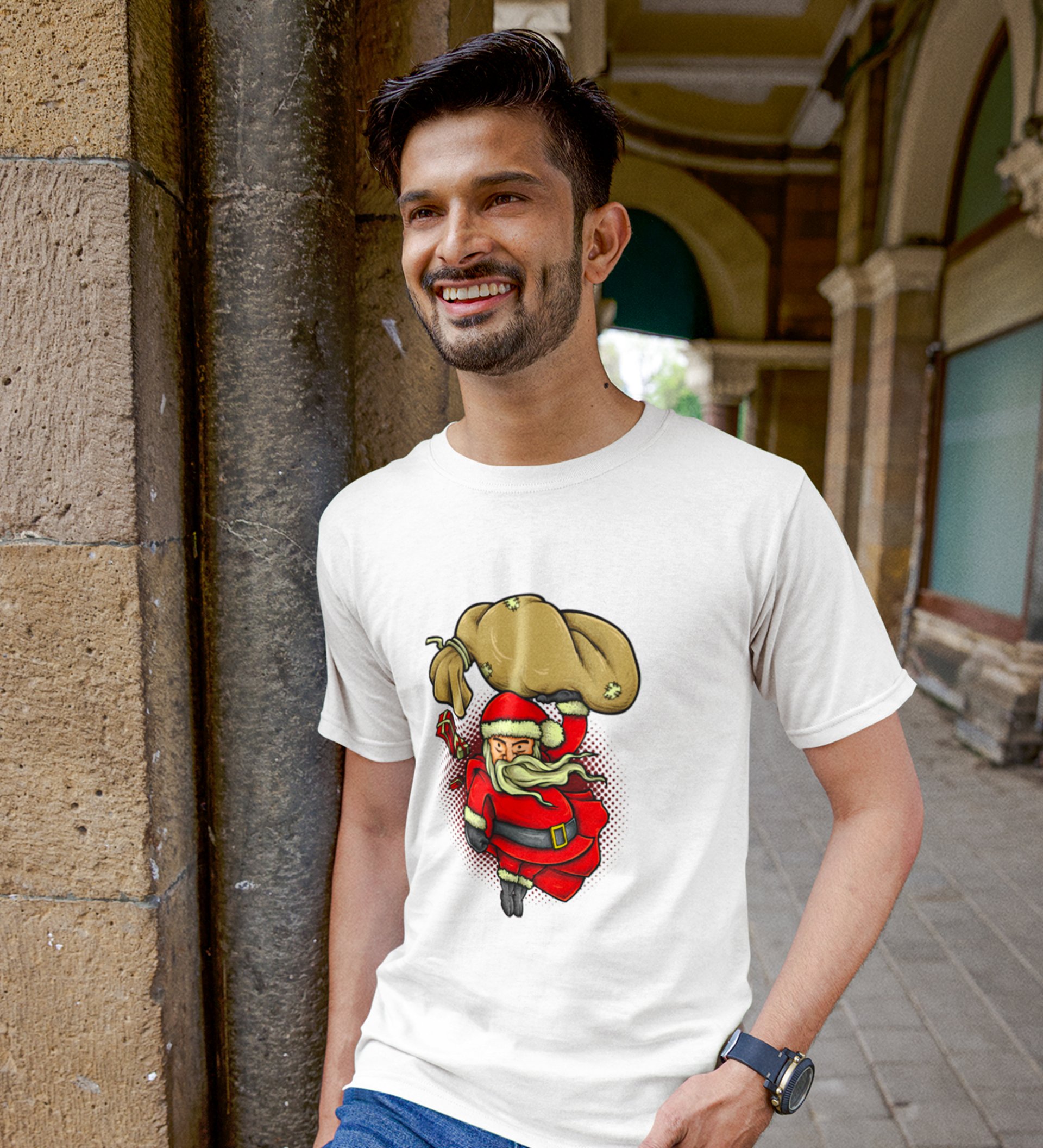 The High Powered Santa White Round Neck Cotton Half Sleeved Men's T-Shirt with Printed Graphics