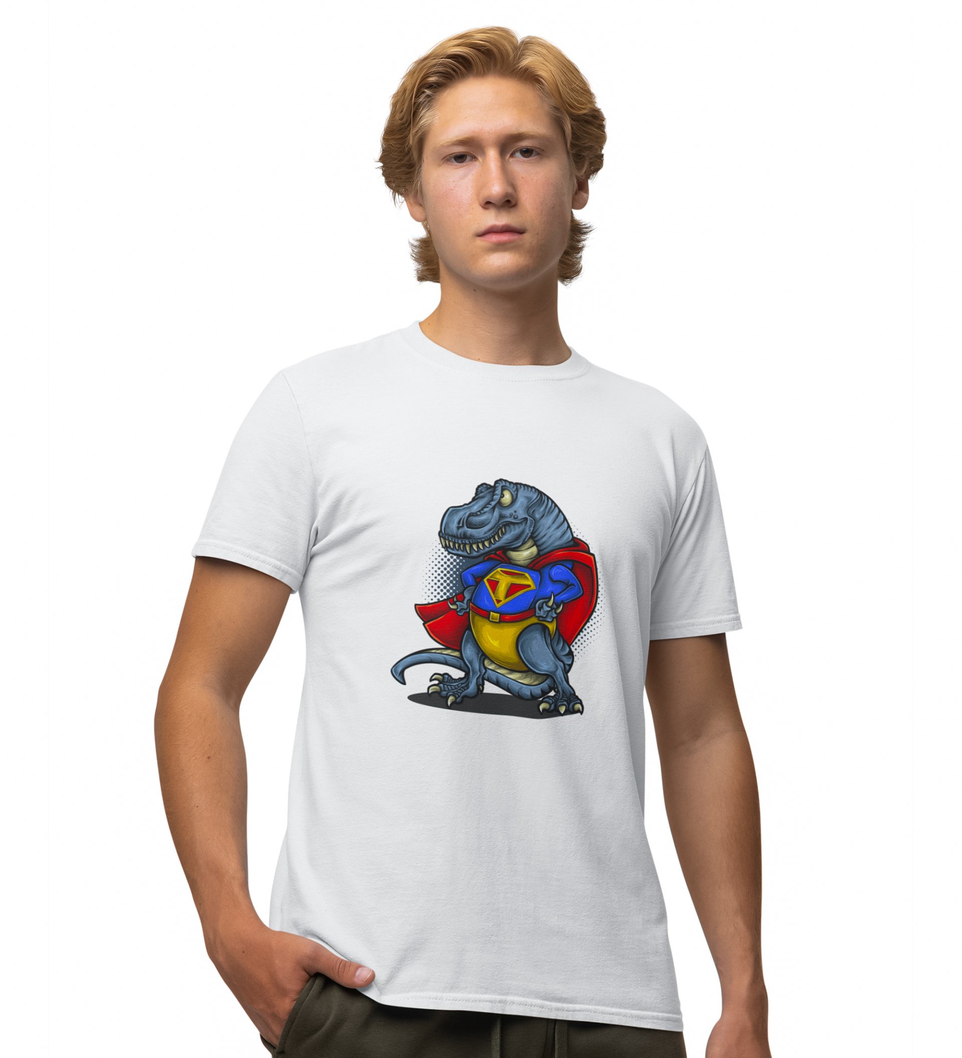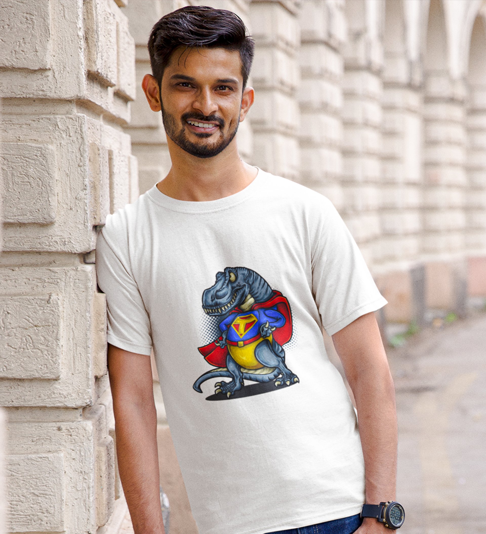 Super Dino White Round Neck Cotton Half Sleeved Men's T-Shirt with Printed Graphics
