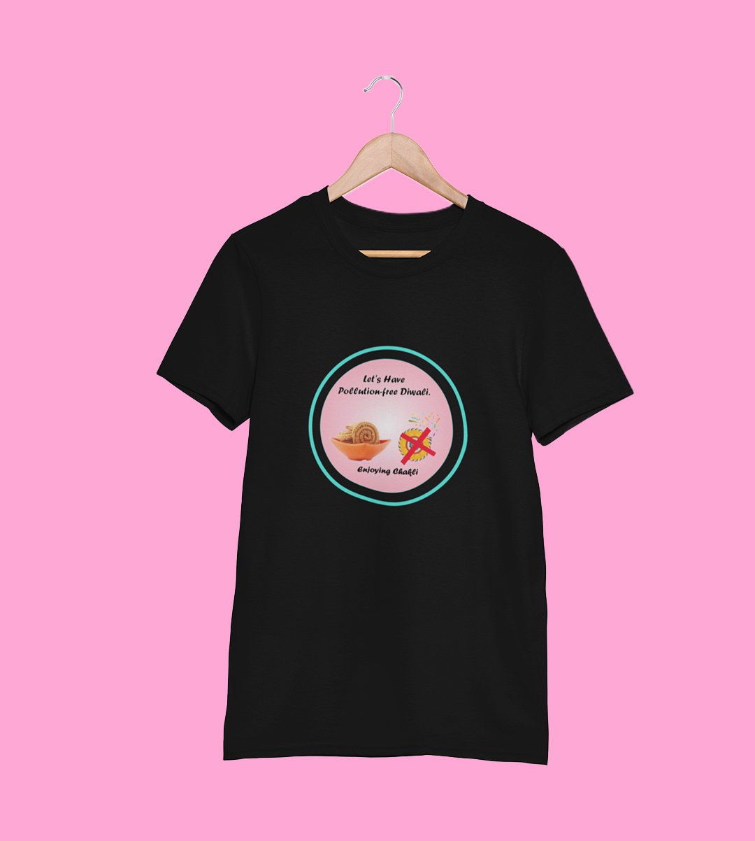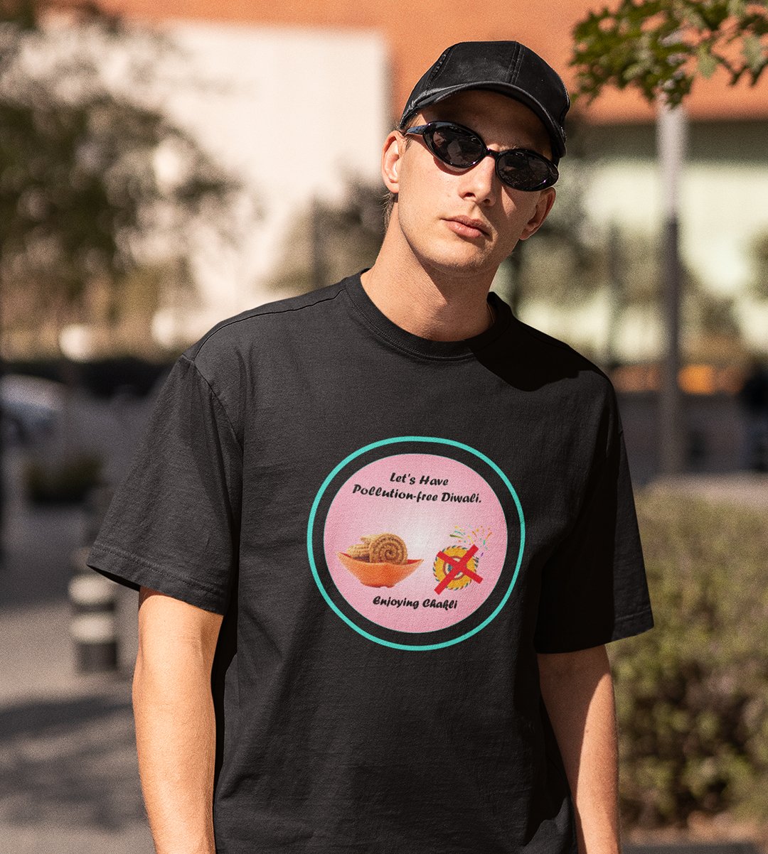 Let's have pollution free diwali printed diwali themed unisex round neck blended black t-shirt specially for diwali festival