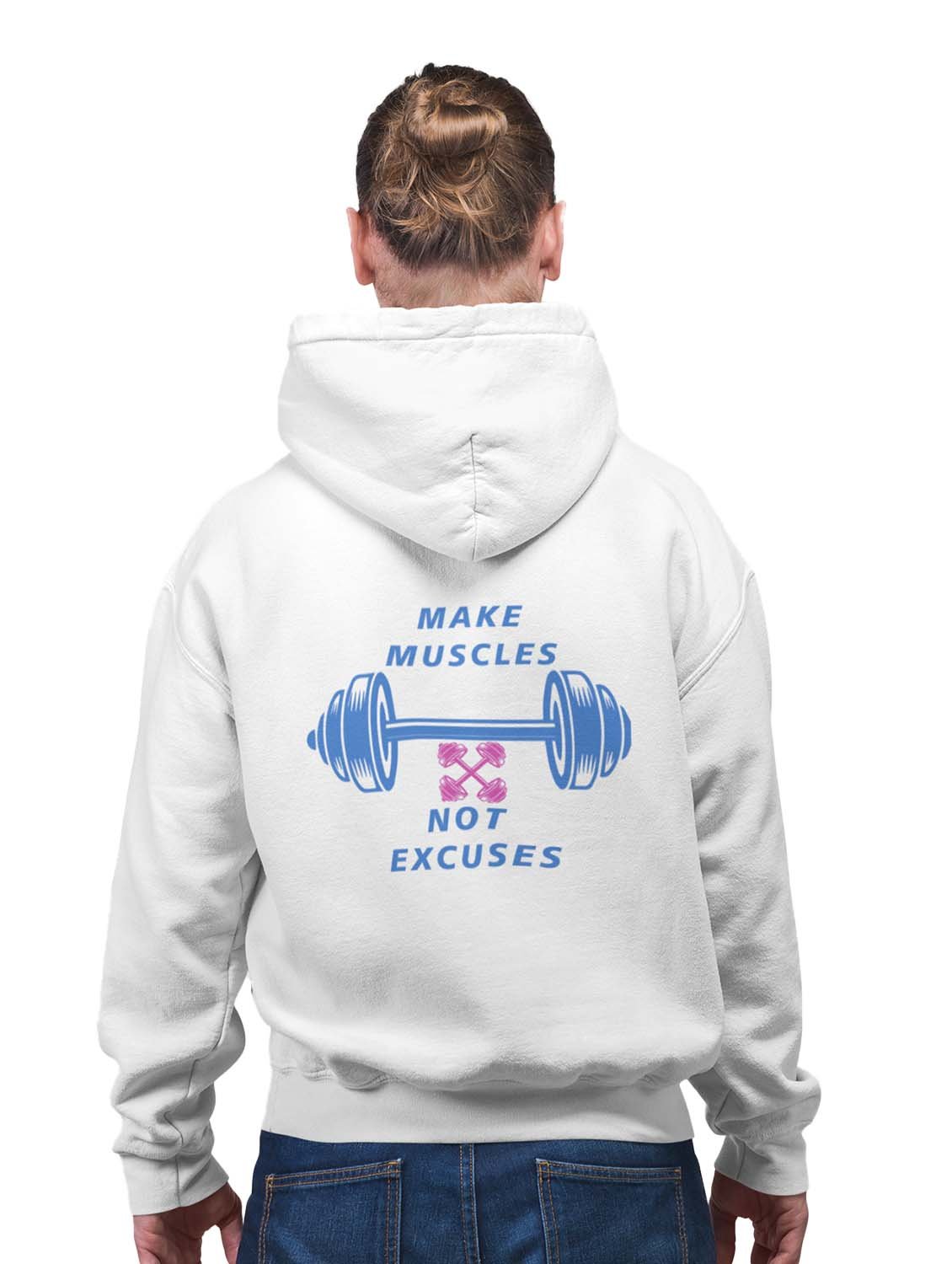 Make Muscles, Not Excuses, (Purple Text) printed artswear white hoodies for winter casual wear specially for Men
