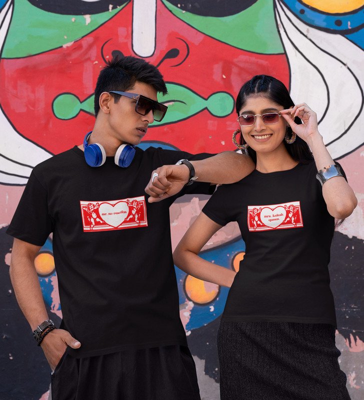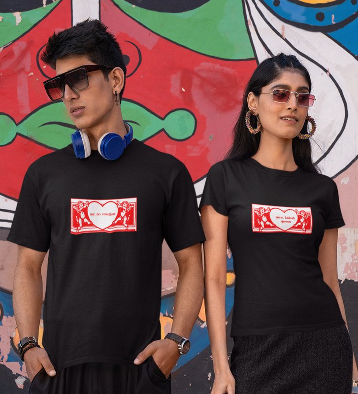 Mr No Reaction/ Mrs Kalesh Queen Printed Couple (Black) T-Shirts
