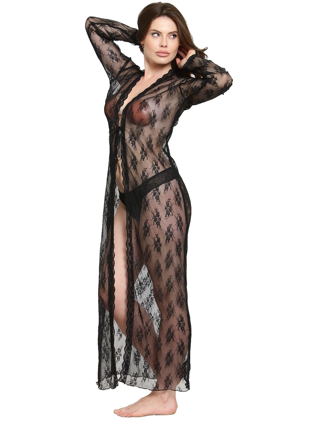 N-Gal Women's Polyester Open Front Long Sleeves Floral Full Length Night Robe with G-String_Black