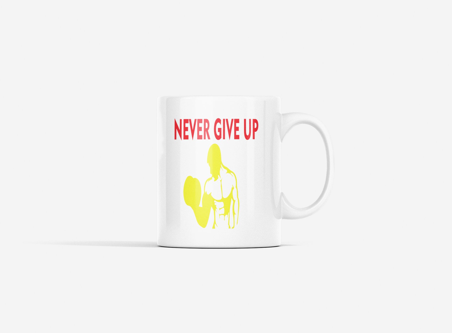 Never Give Up, Muscle Man- Yellow - gym themed printed ceramic white coffee and tea mugs/ cups for gym lovers