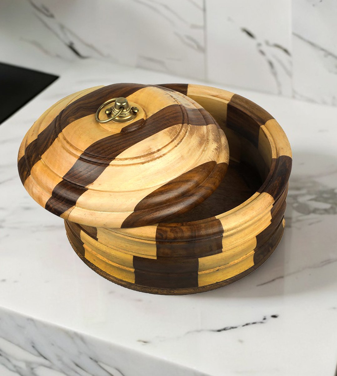 Wooden casseroles are used to keep chapatis in it and helps to keep the rotis warm for a longer period of time. its assurance of long lasting product. Made up of wood which puts forward of Indian craftsmanship. It is used in kitchen and its existance in dining table brings the table's look more graceful. Wooden roti container looks attractive because of its vertical brown striped type design. It is used in kitchen and dining table. It can also be kept as a showpiece in your showpiece rack, cupboards. Everyone has their favourite one to choose from. It looks superior in transparent cupboards. We have brought you many wooden and stylish wooden casseroles of different designs. Grab it now. Add an element of beauty to your dining table. It could be a memorable gift for birthdays, marriage parties, house warming, anniversary, kitty party etc, it can be a memorable return gift. What can be a better gift than an unique wooden casseroles for your family? Gift it to yourself, spouse, mother, relative or your loved ones. All Occasion Gift.