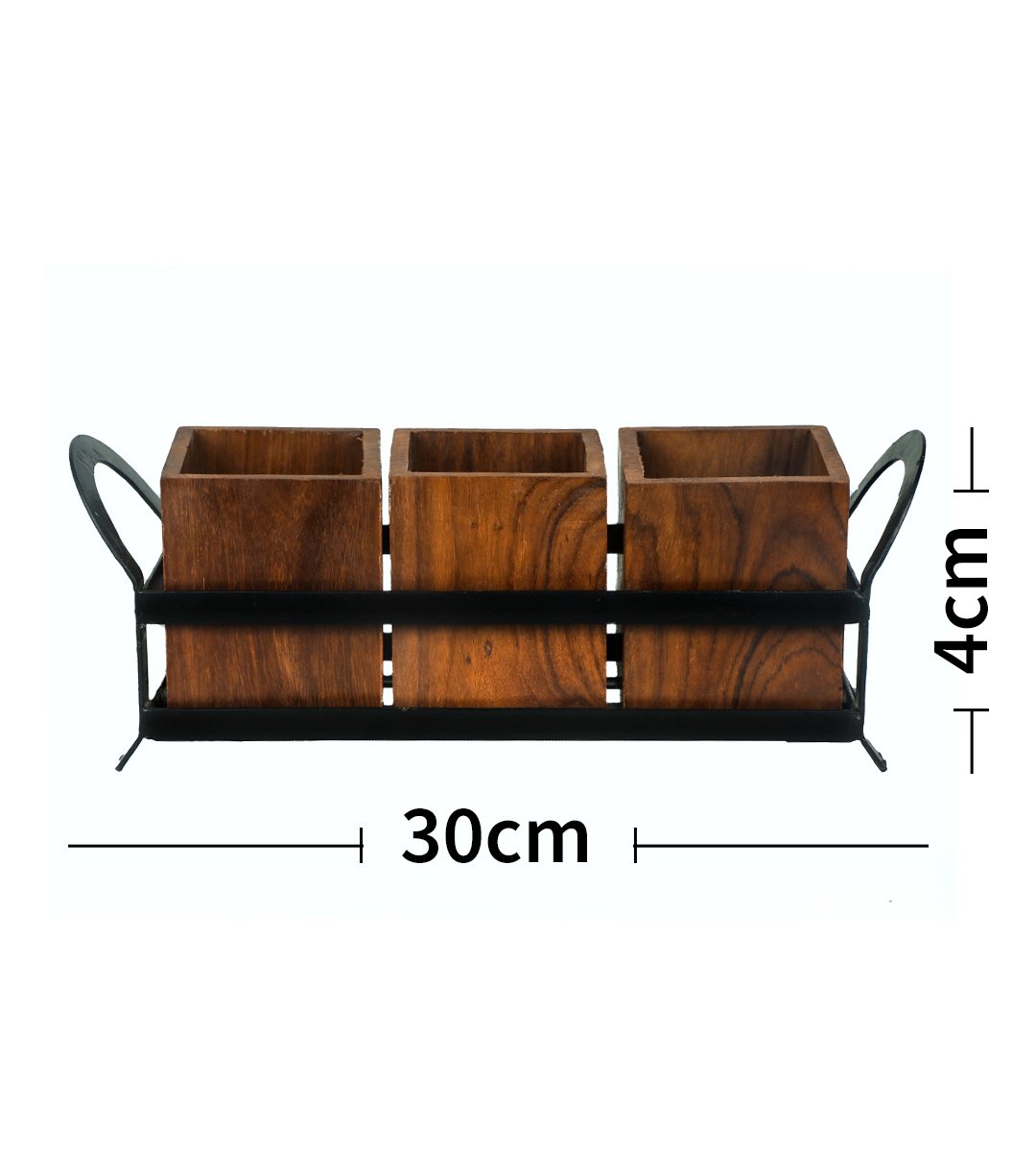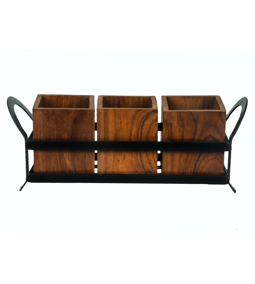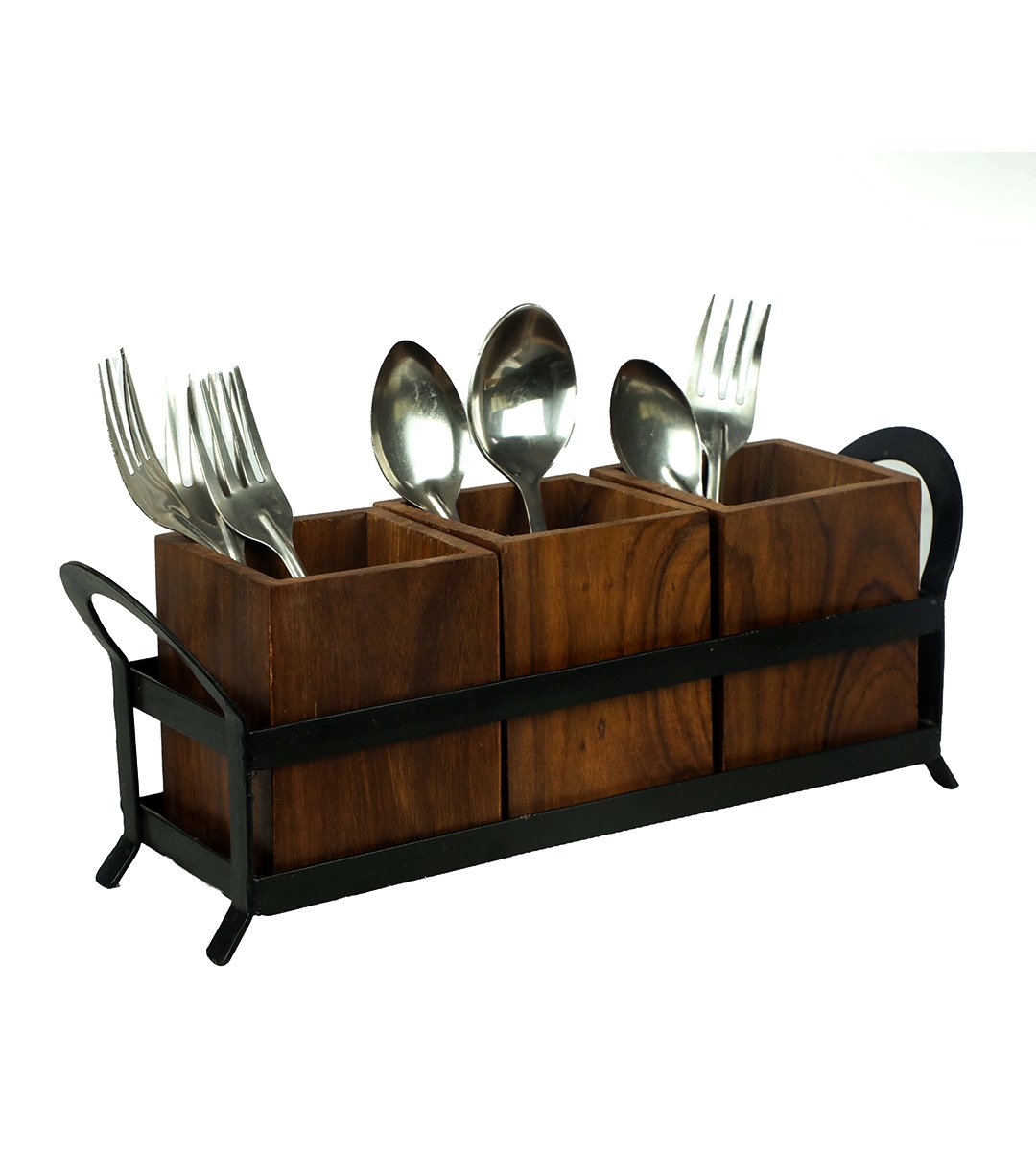 Wooden 3 cutlery holders with a iron border stand which is attracting and this item also can be used as a kitchen's showpiece. It brings spectacular view in the dining room. It adds more grace to the dining table with its brownish colour and smooth surface. It can store butter knives, spoons, forks, ladles, tissue paper etc. Everyone has their favourite one to choose from. We have brought you many wooden cutlery items of different designs. It brings spectacular view in the dining room. Adds more grace to the dining table with its brownish colour and smooth surface. Gifting material to mothers, relatives and dear ones. Grab it now.