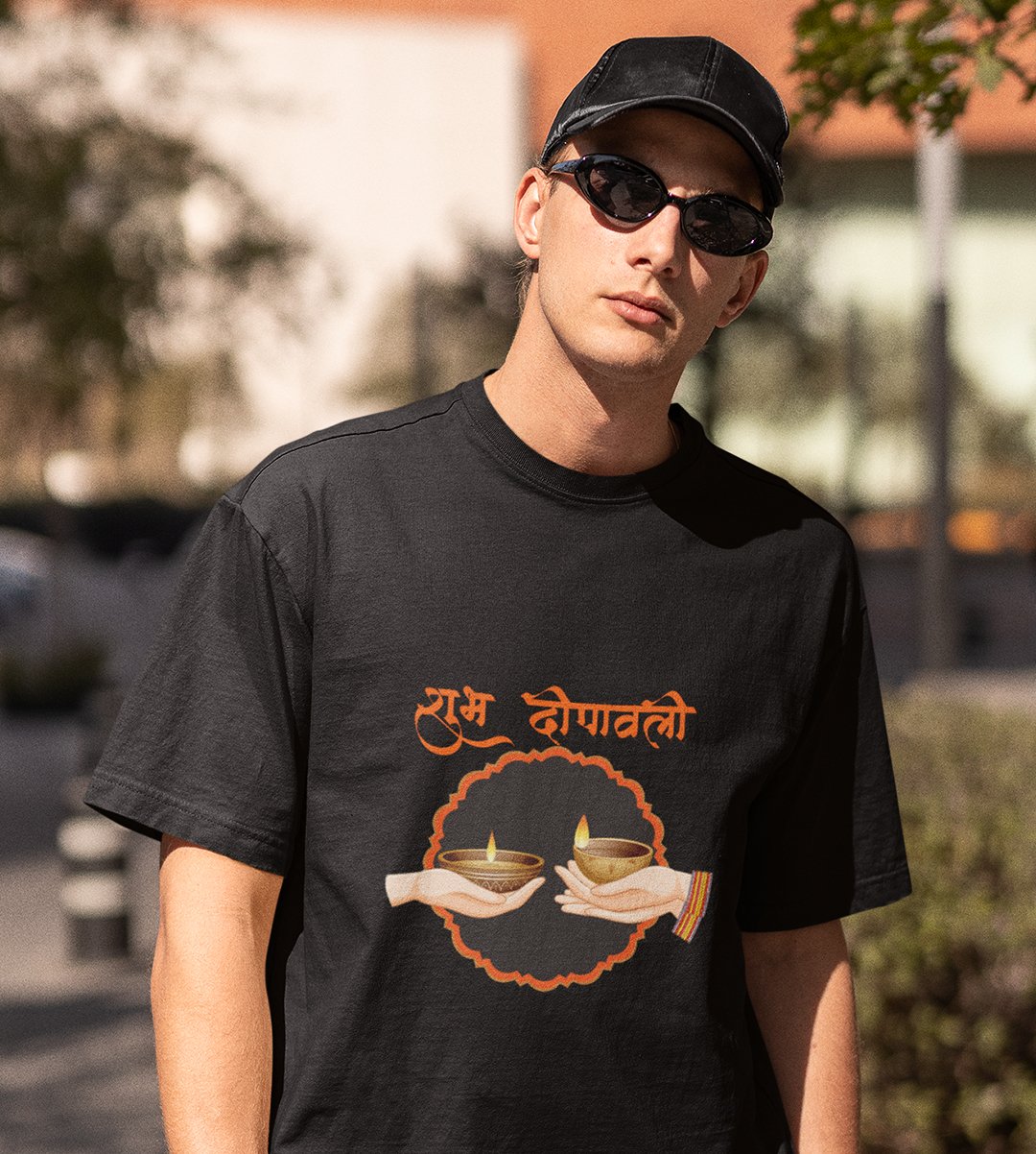 Shubh Dipawali printed diwali themed unisex round neck blended black t-shirt specially for diwali festival