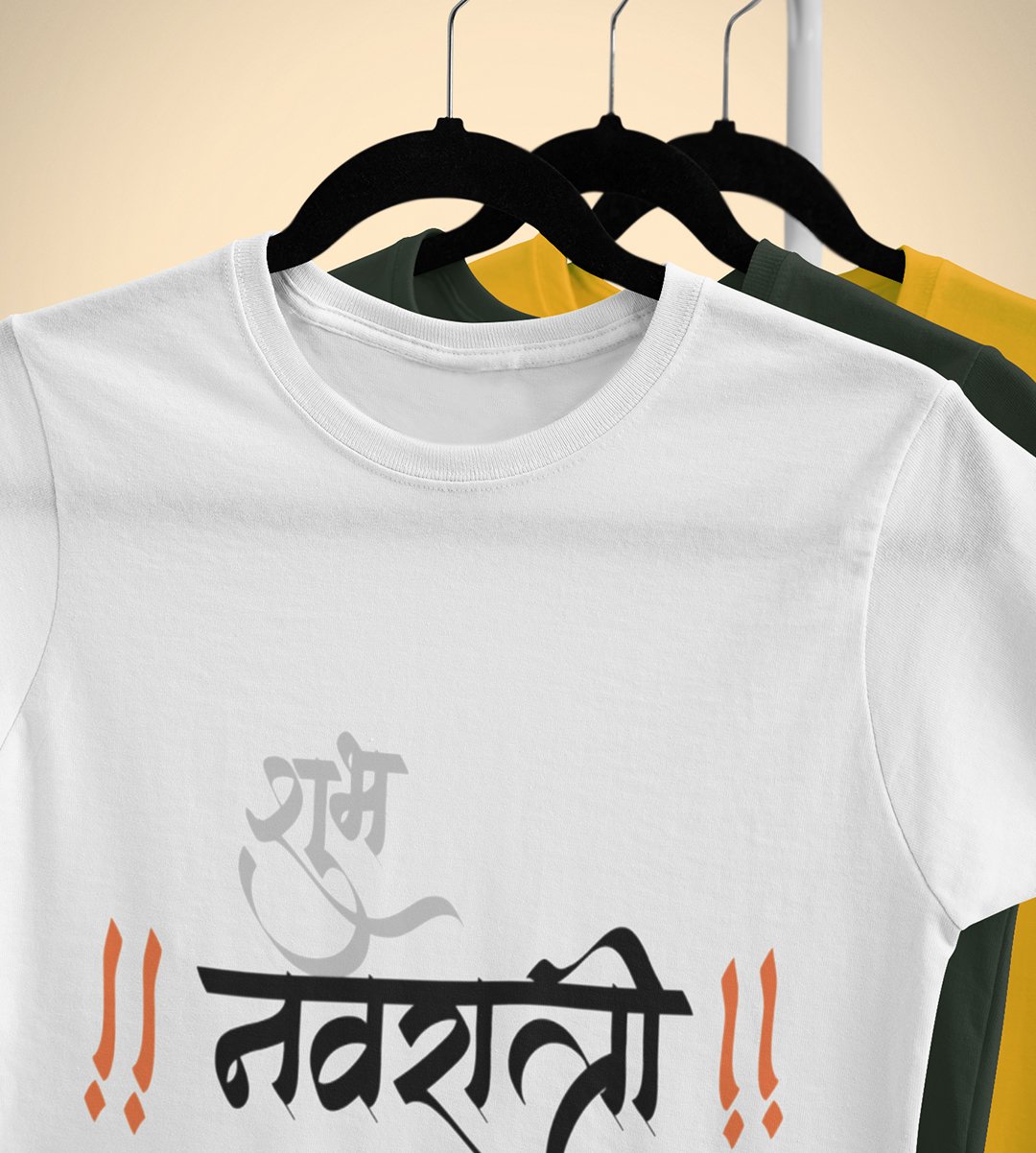 Navratri is a very auspicious festival for hindus. It takes place at the beginning of October and sometimes September. Enjoy the 9 days of festivities with full zeal and make yourself submerged in the love of Maa Durga. Navratri is also known as Durga Puja. And with this Tees, you can shine like a star during this festive season with our navratri themed cotton half sleeved Tshirts. You can pair our t-shirts with trousers and denim of your choice and make it a weekday smart casual or weekend wear. This is durable. This tshirt is smooth and soft which makes you comfortable to wear during all seasons. The printing in it is durable and odourless. It has five sizes, S,M,L,XL,XXL. The Tshirt colour is intact even after repeated washes. It can be kept in your wardrobe and hangers. Please avoid washing mashine to clean this Tee, it may affect the print. Hand wash only. We have brought you many navratri related designs printed on our different colour Tshirts to choose from. Grab it now.