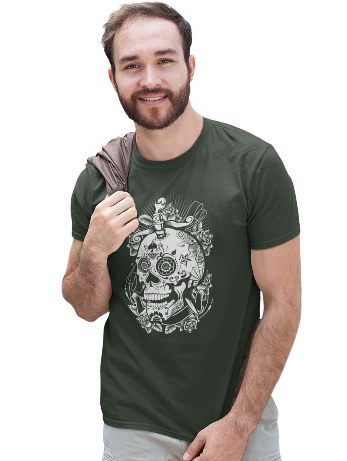 Tattooded Cranium Green Round Neck Cotton Half Sleeved T-Shirt with Printed Graphics