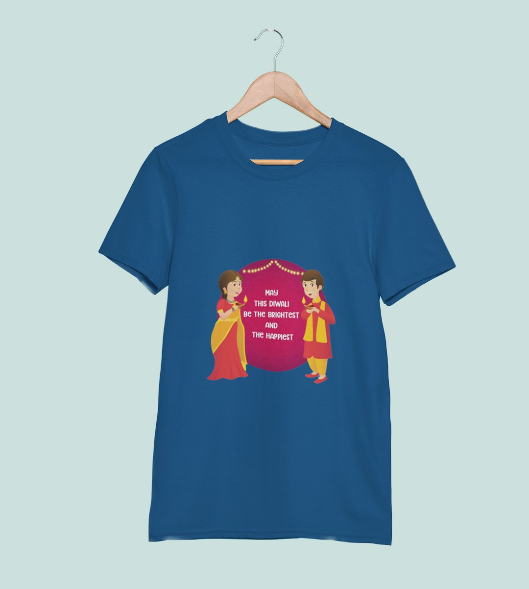 Traditional dressup happy couple printed diwali themed unisex round neck blended blue t-shirt specially for diwali festival