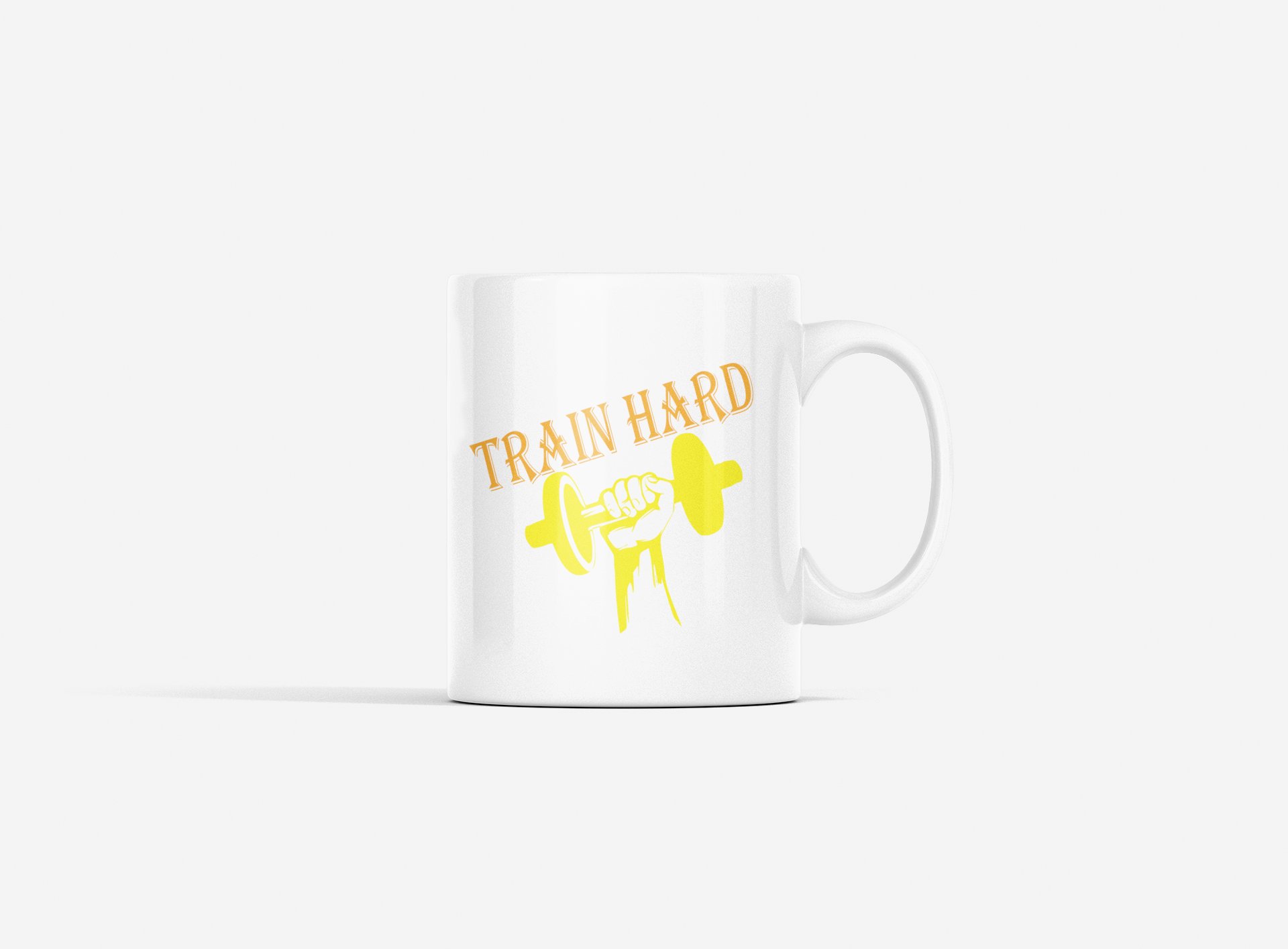 Train Hard,(BG Yellow and Orange) - gym themed printed ceramic white coffee and tea mugs/ cups for gym lovers