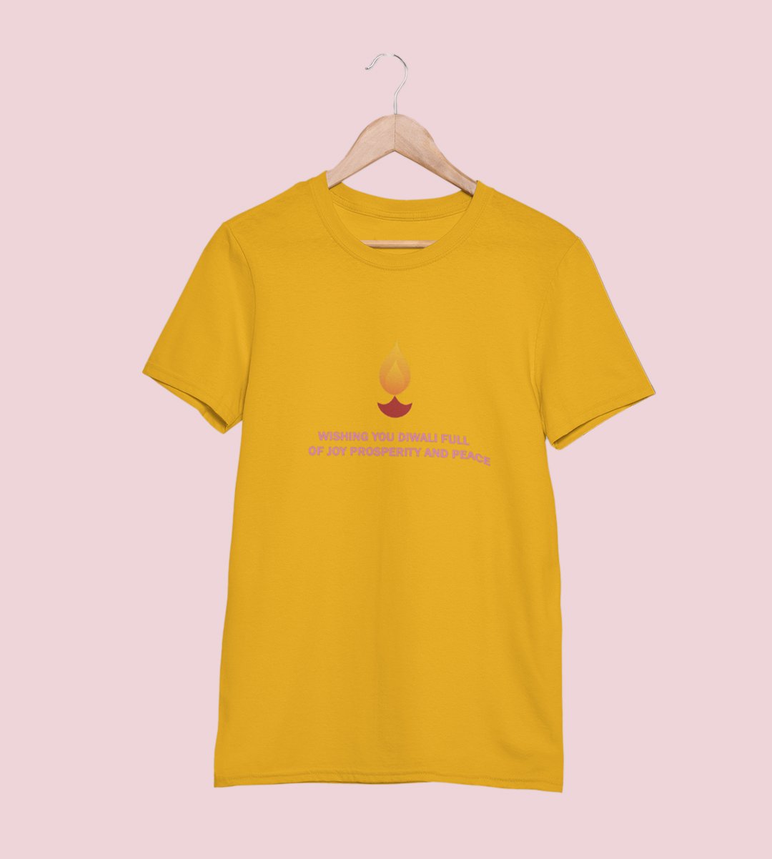 Wishing you printed diwali themed unisex round neck blended yellow t-shirt specially for diwali festival