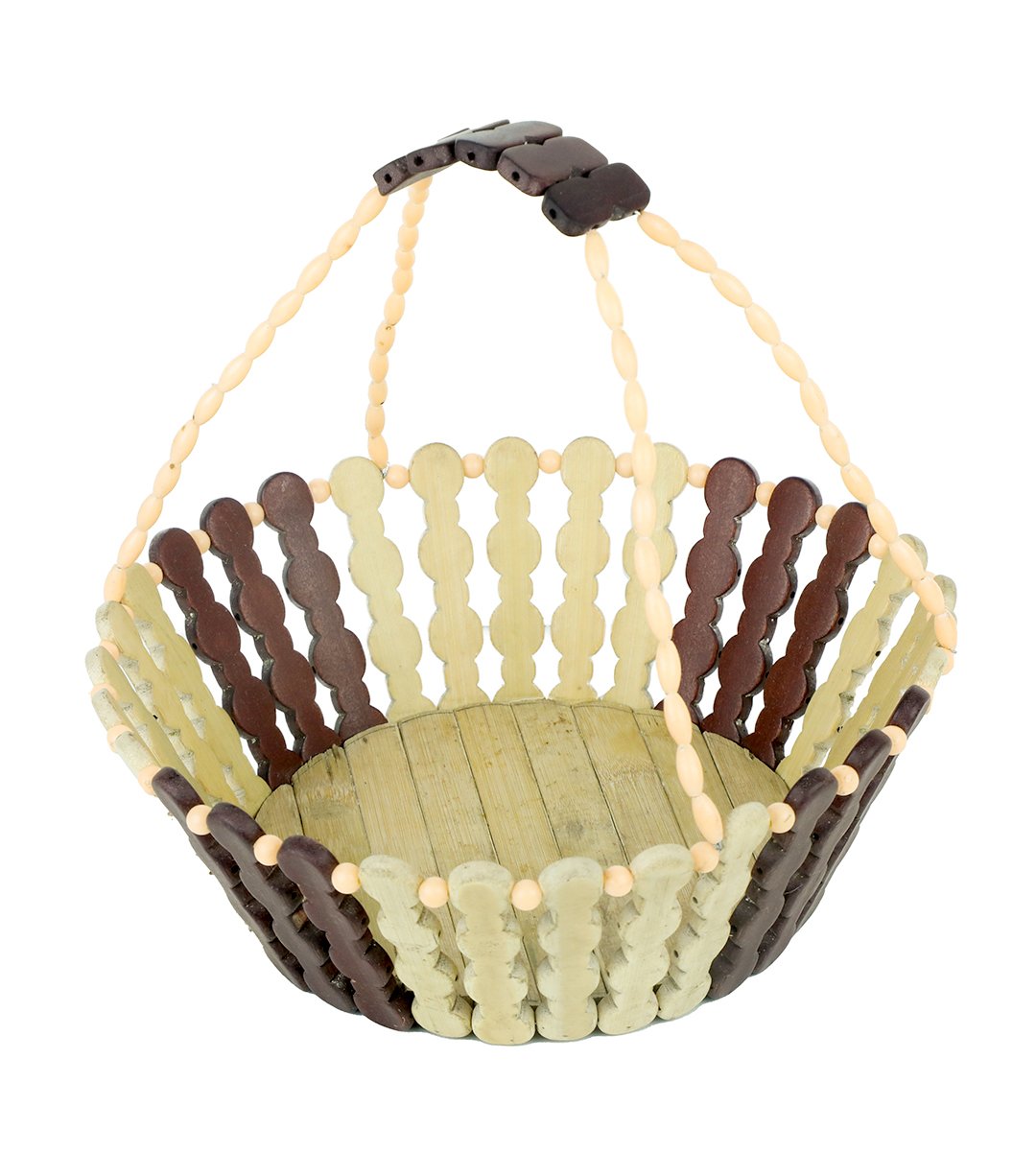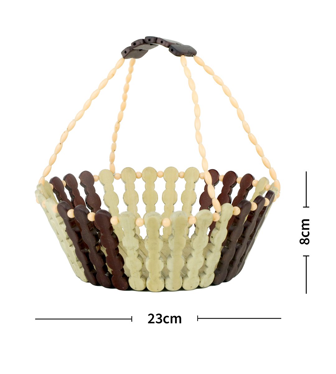 Wooden brown-white vertical bars with hanger fruit and vegetable basket, vessel or a fruit container is used to keep both fruits and vegetables in it. Intricated with every detailing of the product, it is a carryable product. The designs enhancing the product into a classified one. It has best finishing. It is used to keep in dining tables and center tables. You must have your favourite one. We have brought you many fruit and vegetable containers to choose from. You can gift it to your family, relatives, friends, siblings. Also it can be gifted in birthdays, marriages, anniversaries, house warming parties, christmas parties, kitty parties etc. Grab it as soon as possible.