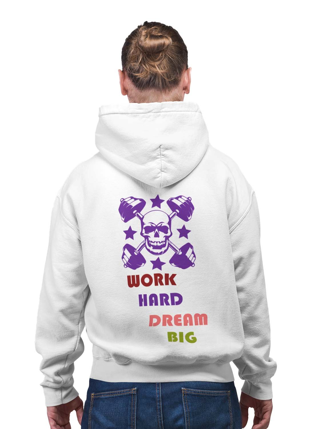 Work Hard, Dream Big, Violet Skull printed artswear white hoodies for winter casual wear specially for Men