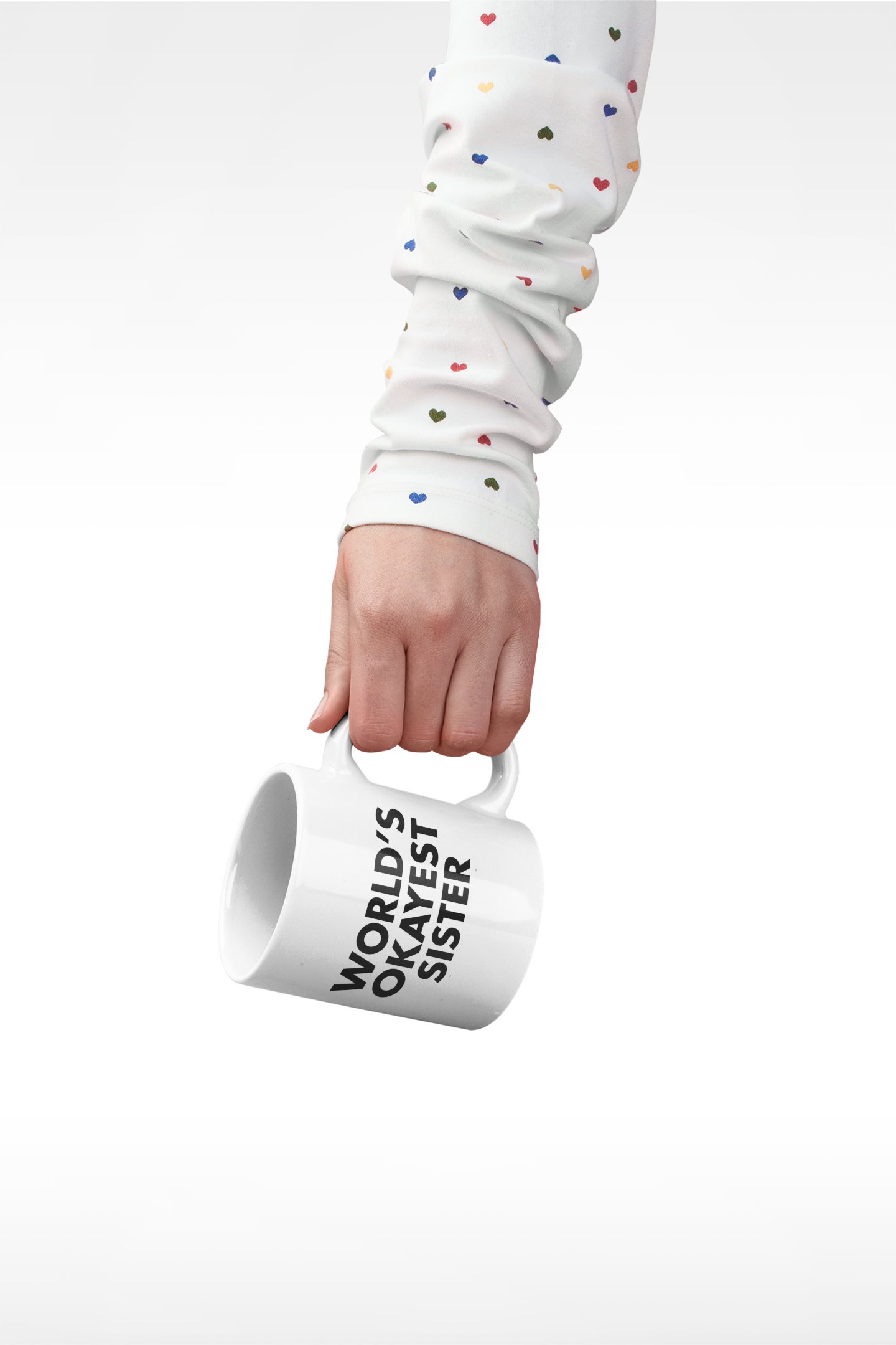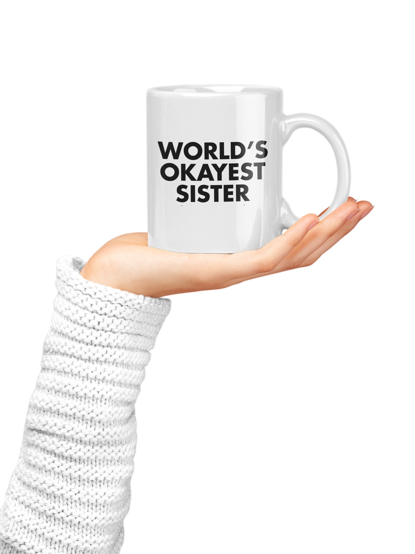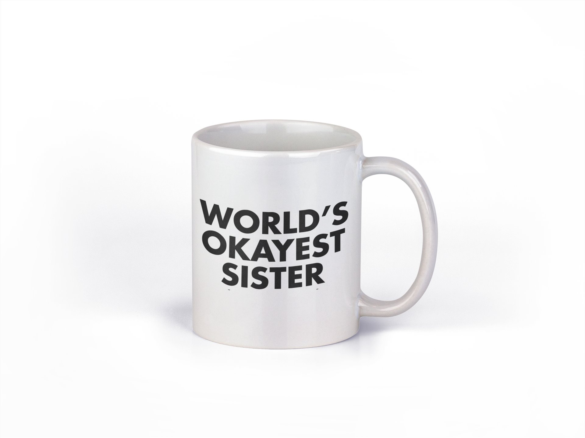 World's okayest sister - family themed printed ceramic white coffee and tea mugs/ cups